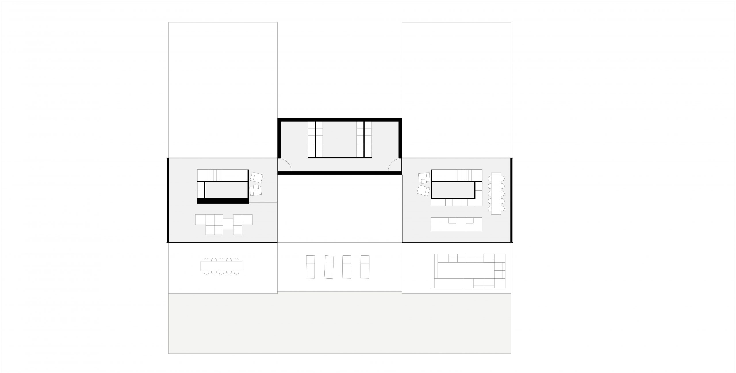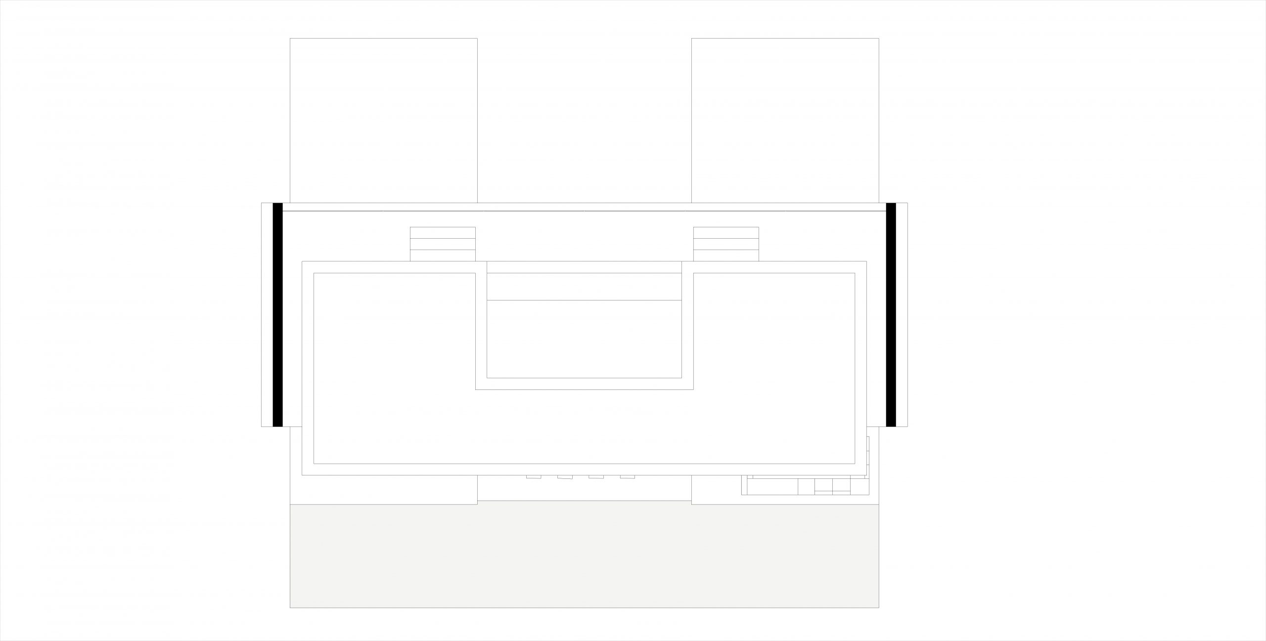 The upper volume seems to float, no structure is visible from the outside. The construction is cleverly disguised, hidden behind mirror cladding in between the two volumes. It reflects the surroundings, creating an illusion of continuity.