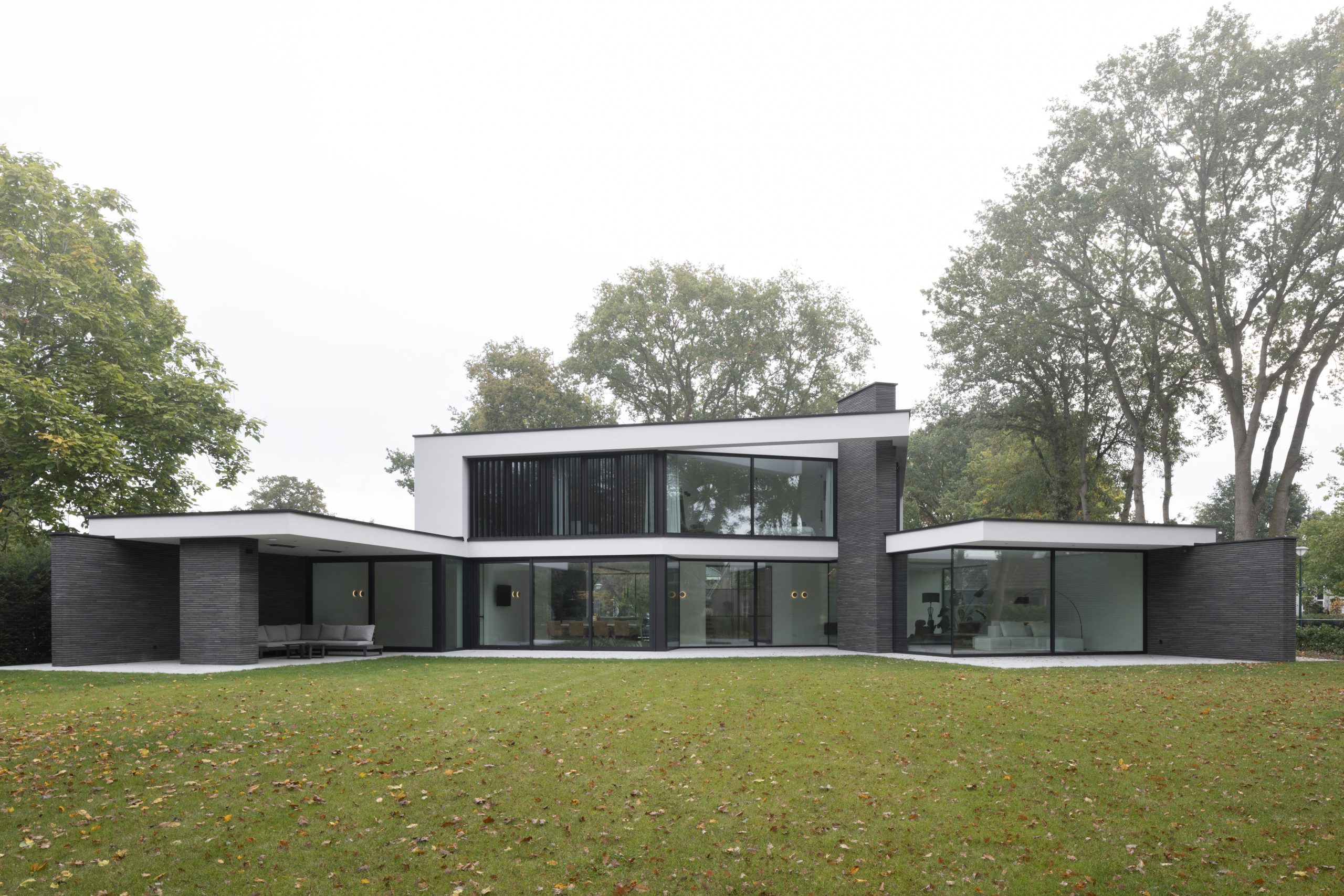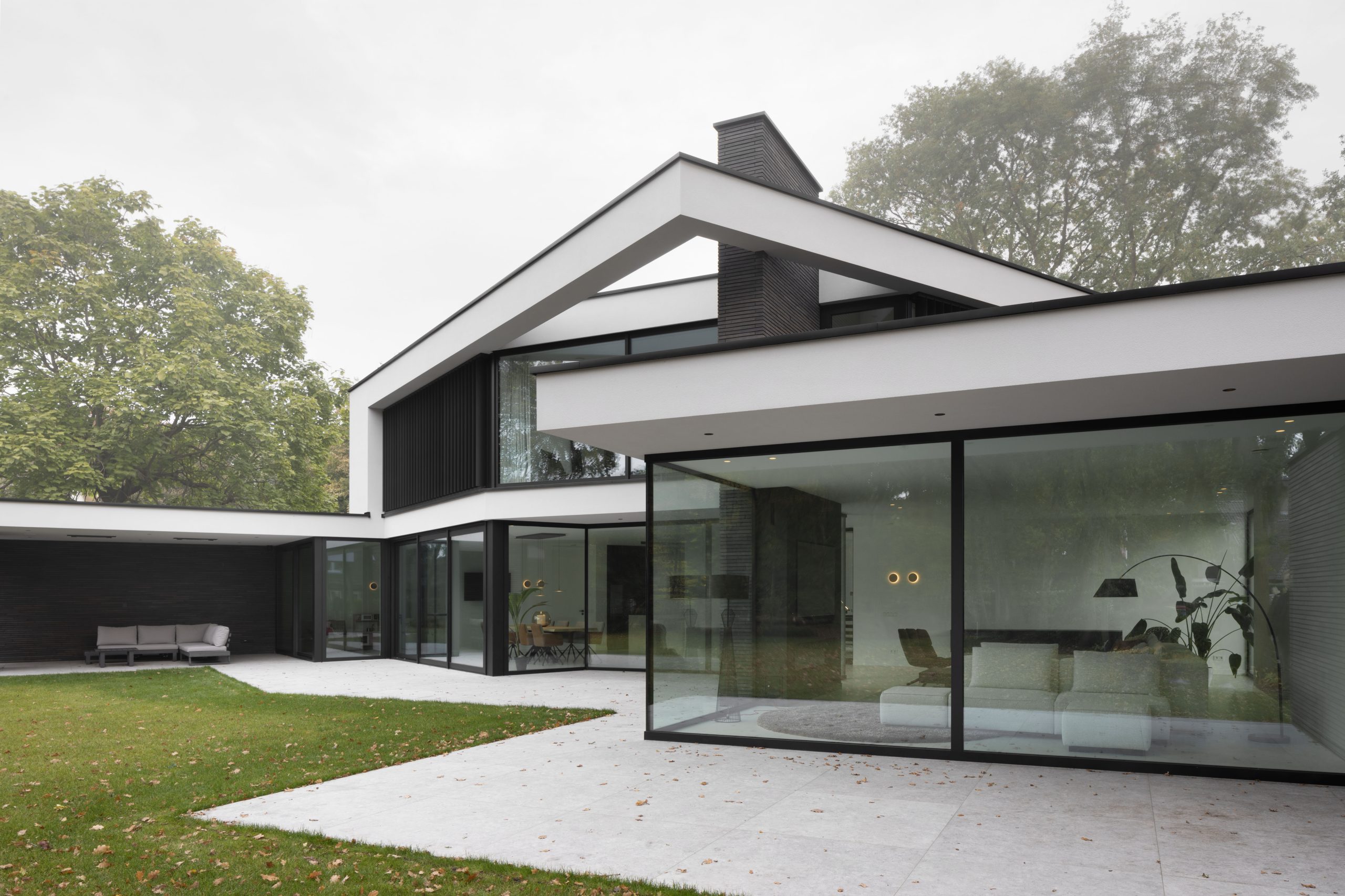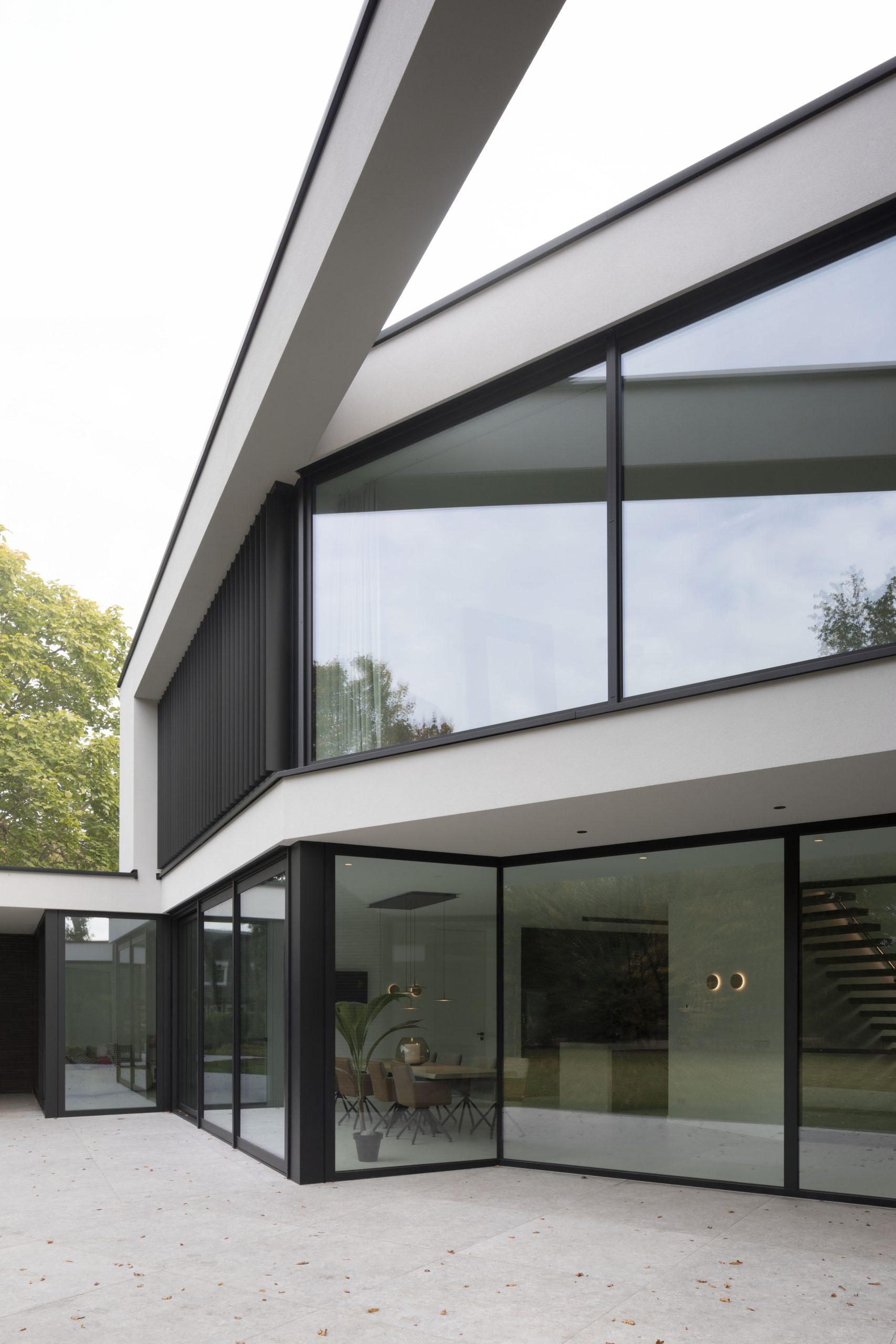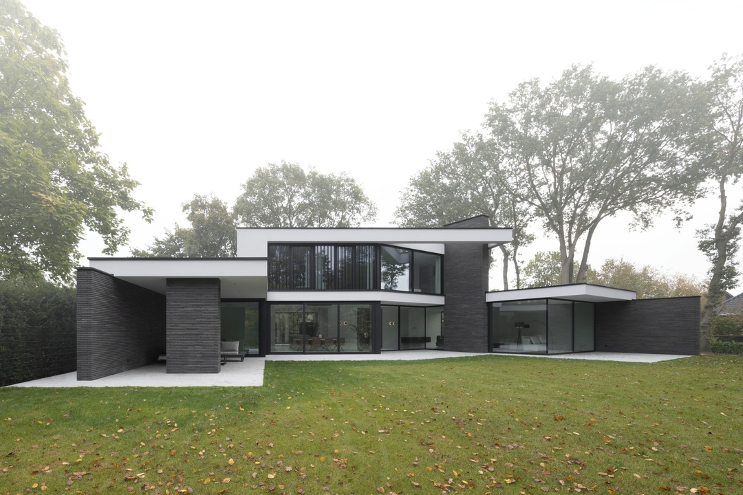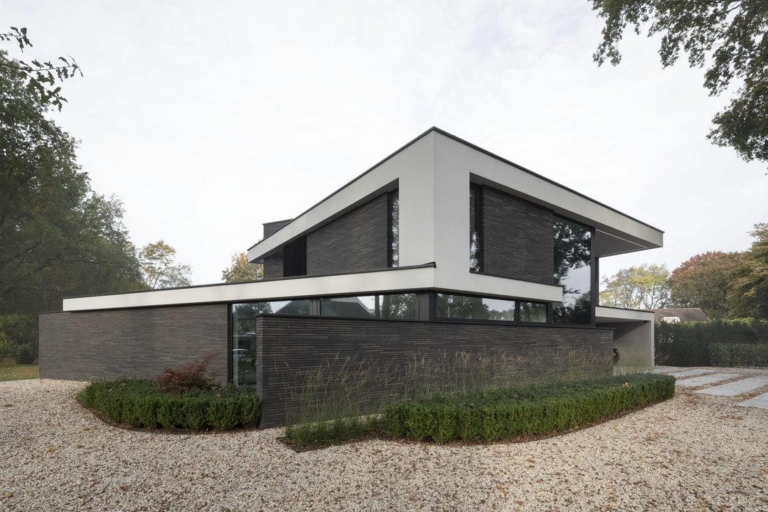 The design originates from one main volume with two sub-volumes on either side. These sub-volumes are subsequently angled towards the contours of the plot, opening up the design and creating a certain harmony. The floors are accentuated by horizontal lines, making the design feel even more open.