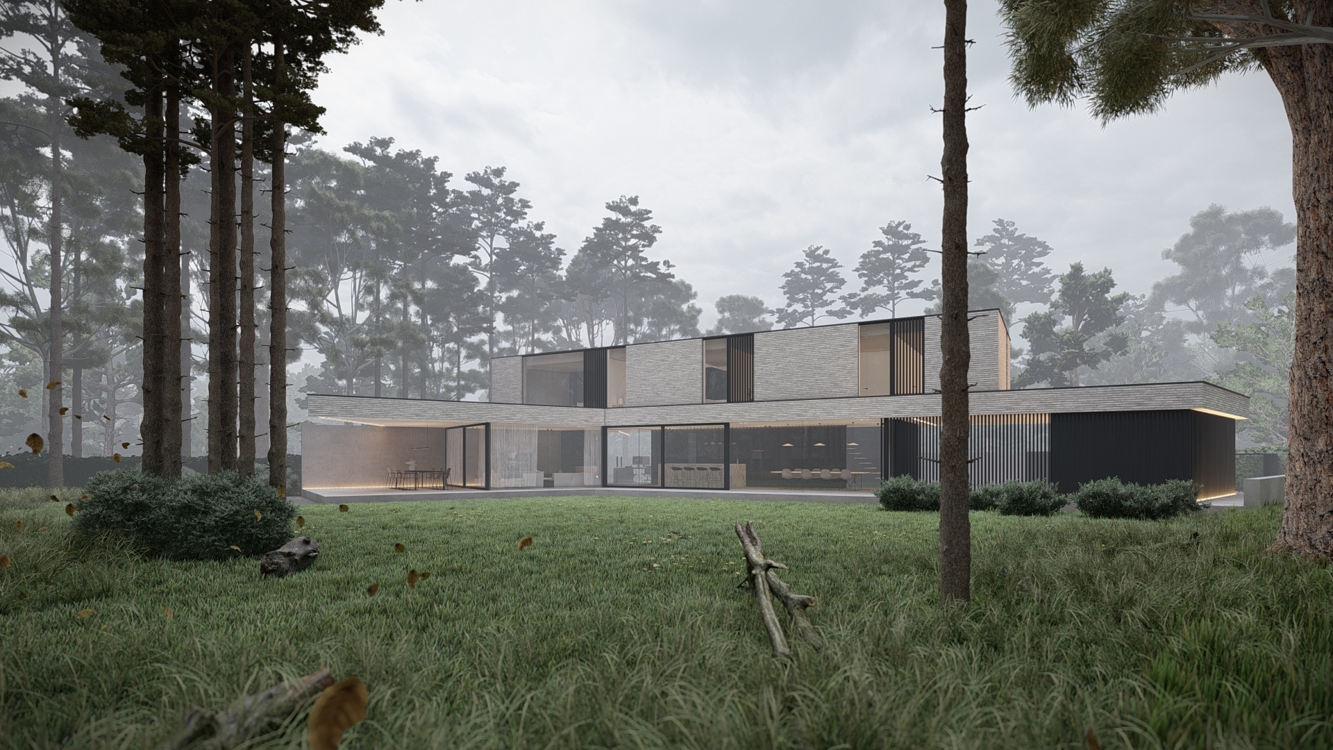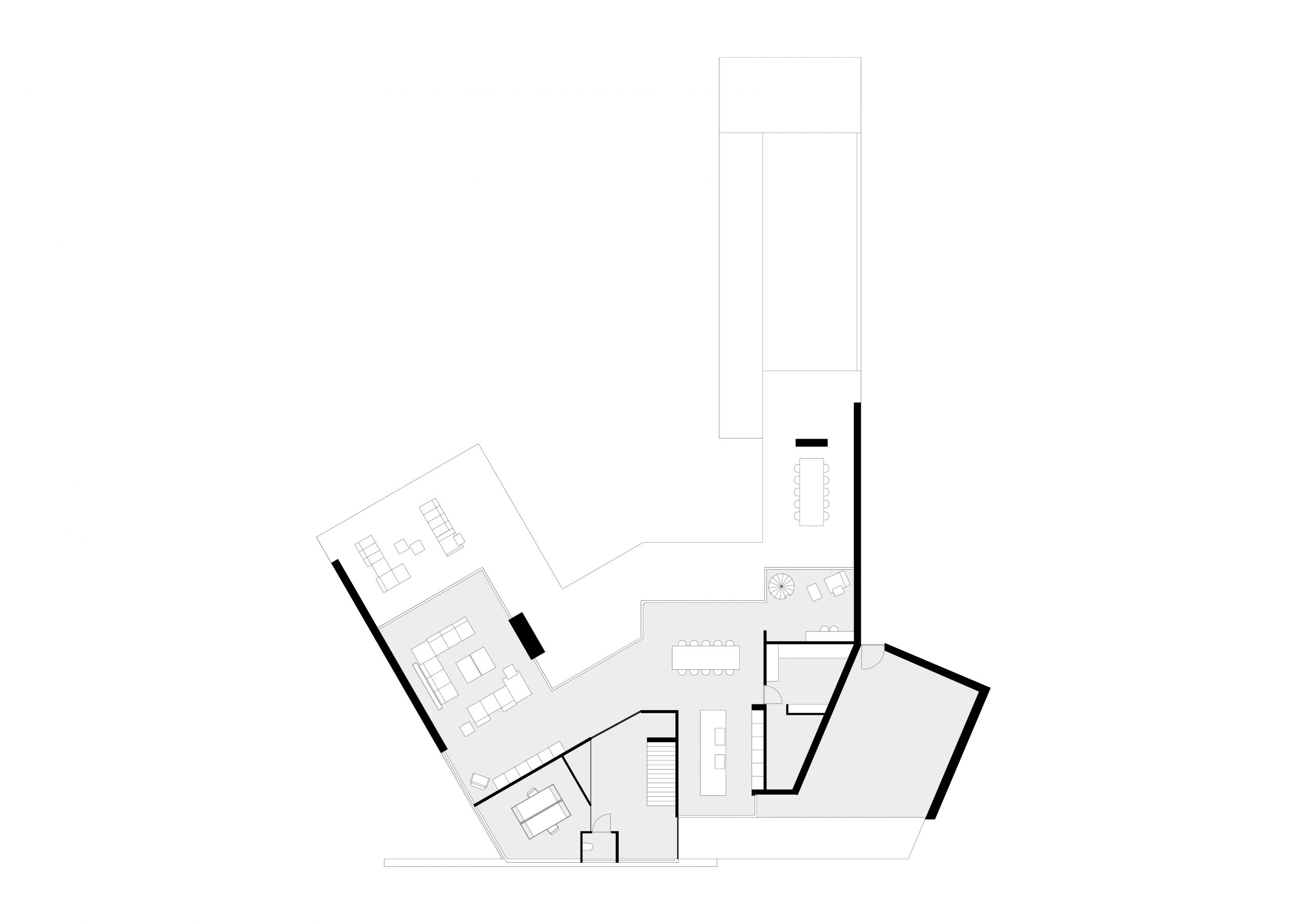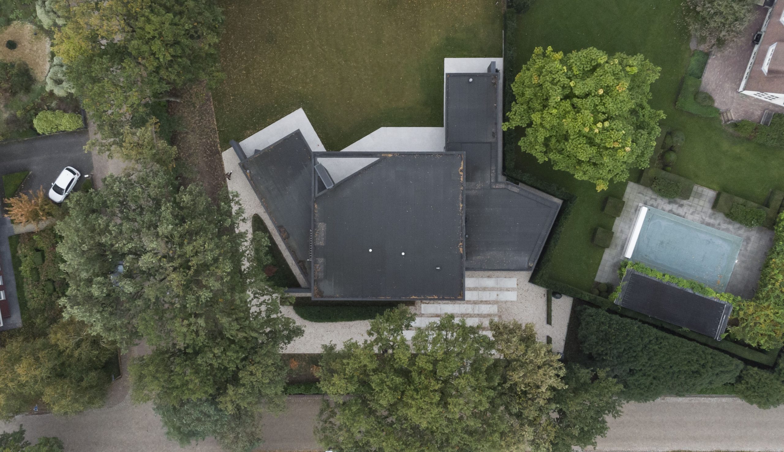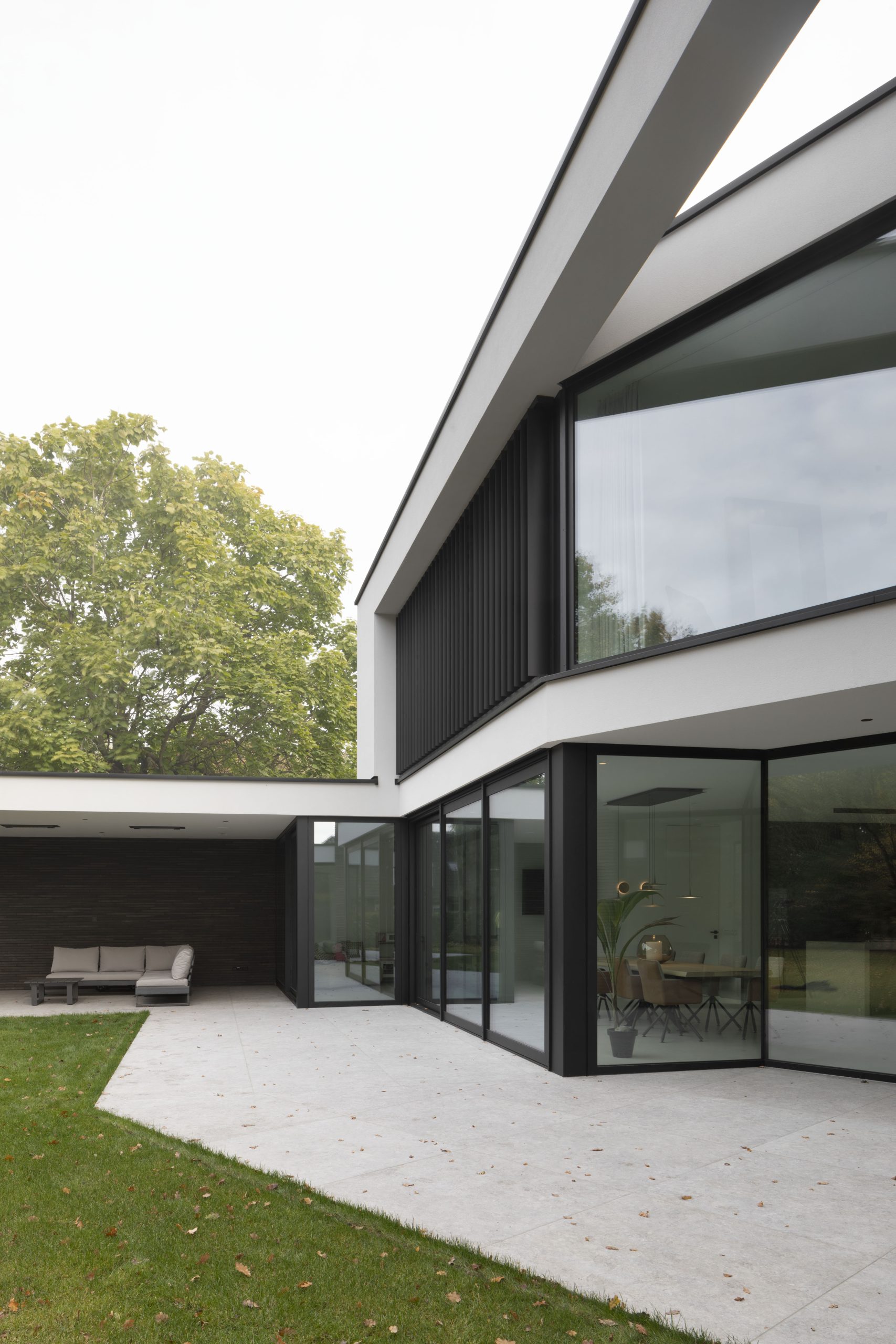The design originates from one main volume with two sub-volumes on either side. These sub-volumes are subsequently angled towards the contours of the plot, opening up the design and creating a certain harmony. The floors are accentuated by horizontal lines, making the design feel even more open.