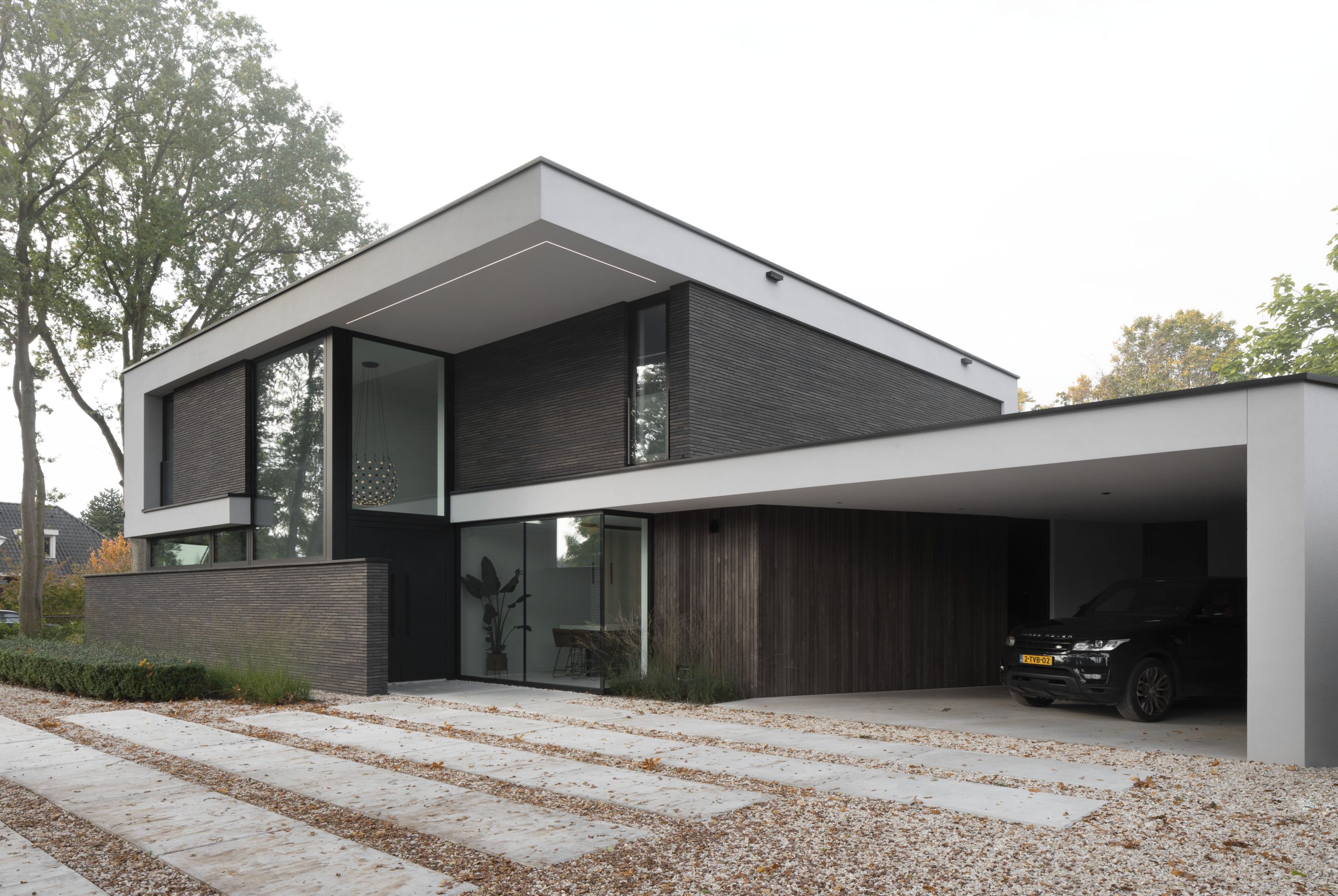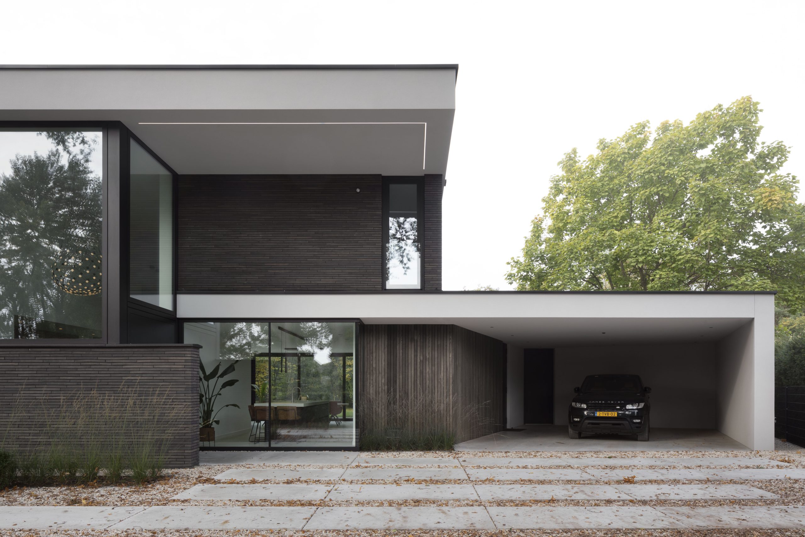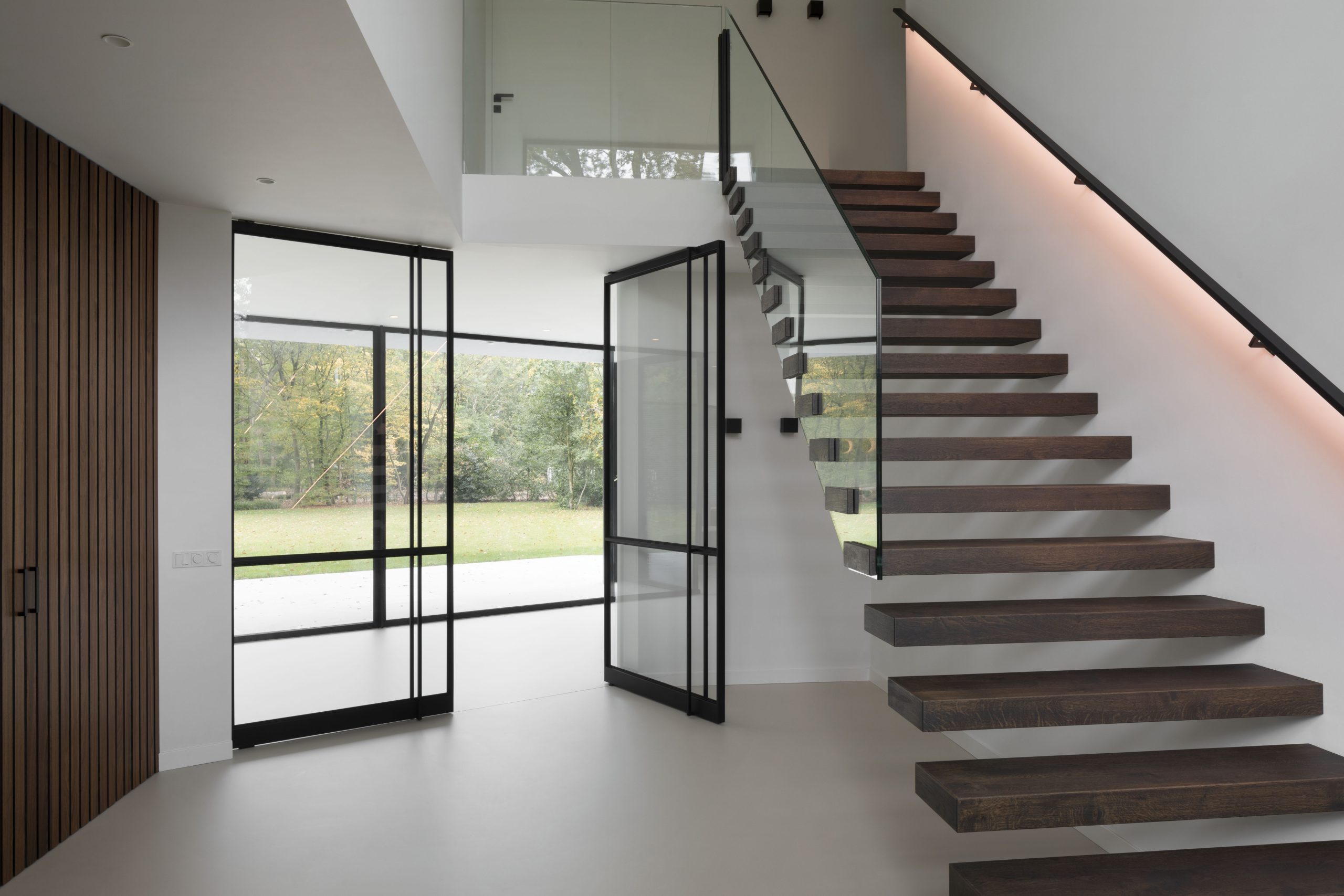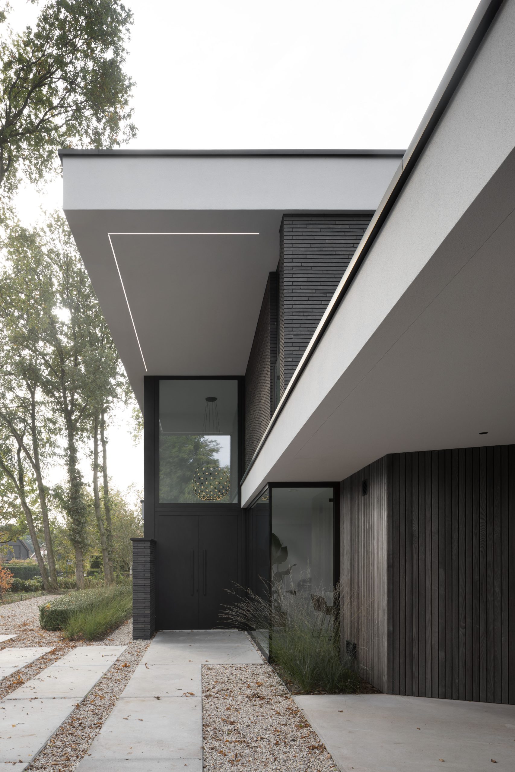While the rear façade is almost entirely transparent, the front façade is mostly closed due to privacy. An exception is made for the entrance, as this doesn’t necessarily require privacy. A grand gesture is made with windows extending all the way to the roof. A large void behind this window creates an imposing scene when entering the building.