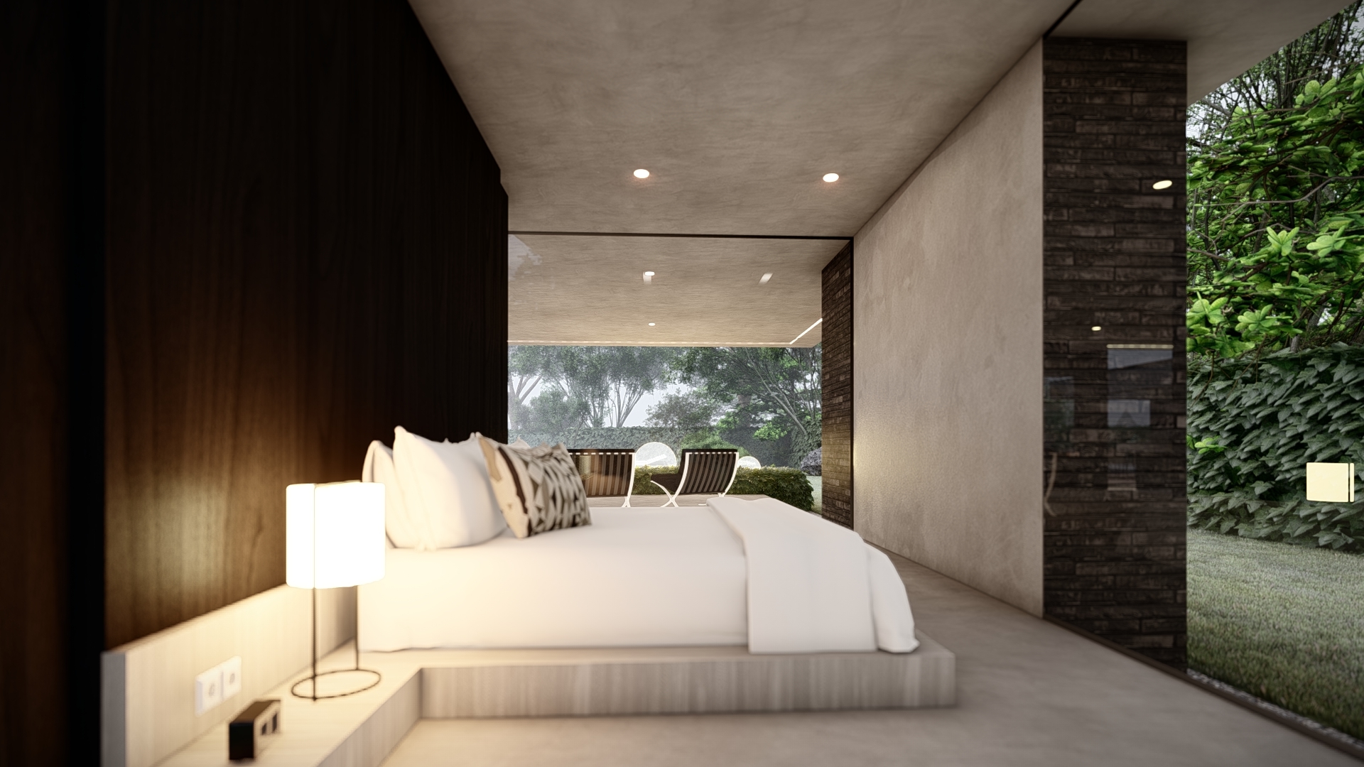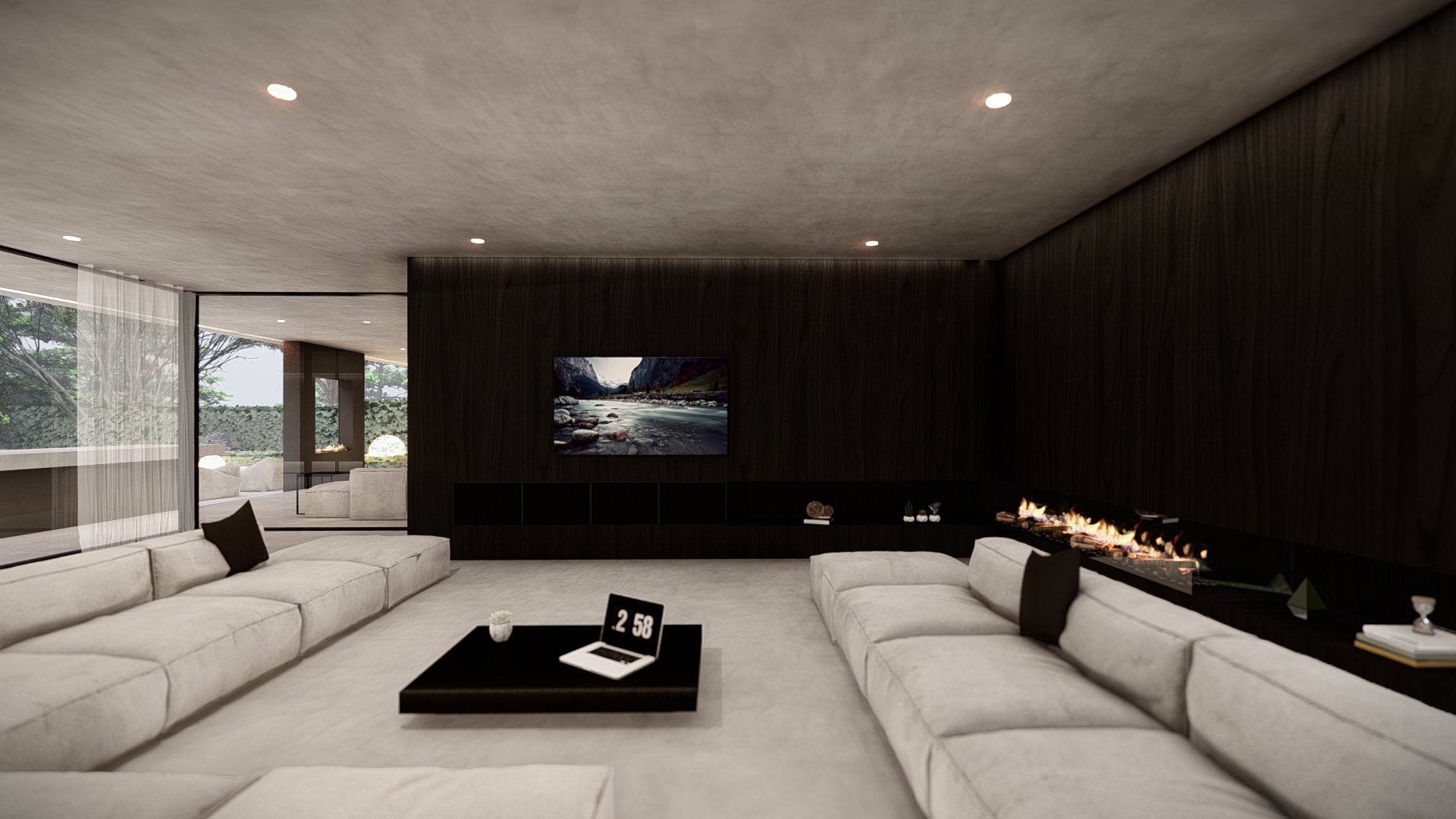 The minimalist details in the exterior are continued in the interior. Subtle details, such as the concealed window frames used in the exterior, now return to the interior. The material usage is reduced to four main textures: concrete, wood, grey stucco and glass. By limiting the number of materials used, the interior creates a calm atmosphere, reflecting outdoor luxury. From the interior, minimalist architecture frames the garden beautifully, fading into the background while nature takes the stage.