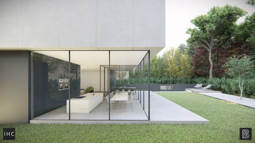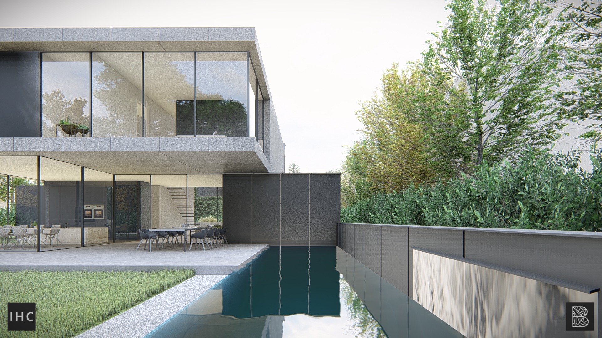 Through a combination of clever structural design, materialisation and usage of glass panels, the upper concrete volume seems to float. This creates a dramatic and dynamic design and also provides a covered outdoor terrace, protected from rain and sun. The large glass panels create an optimal connection with the garden and the koi pond. The pond is framed with architectural lines that extend in the garden, creating a finished composition.