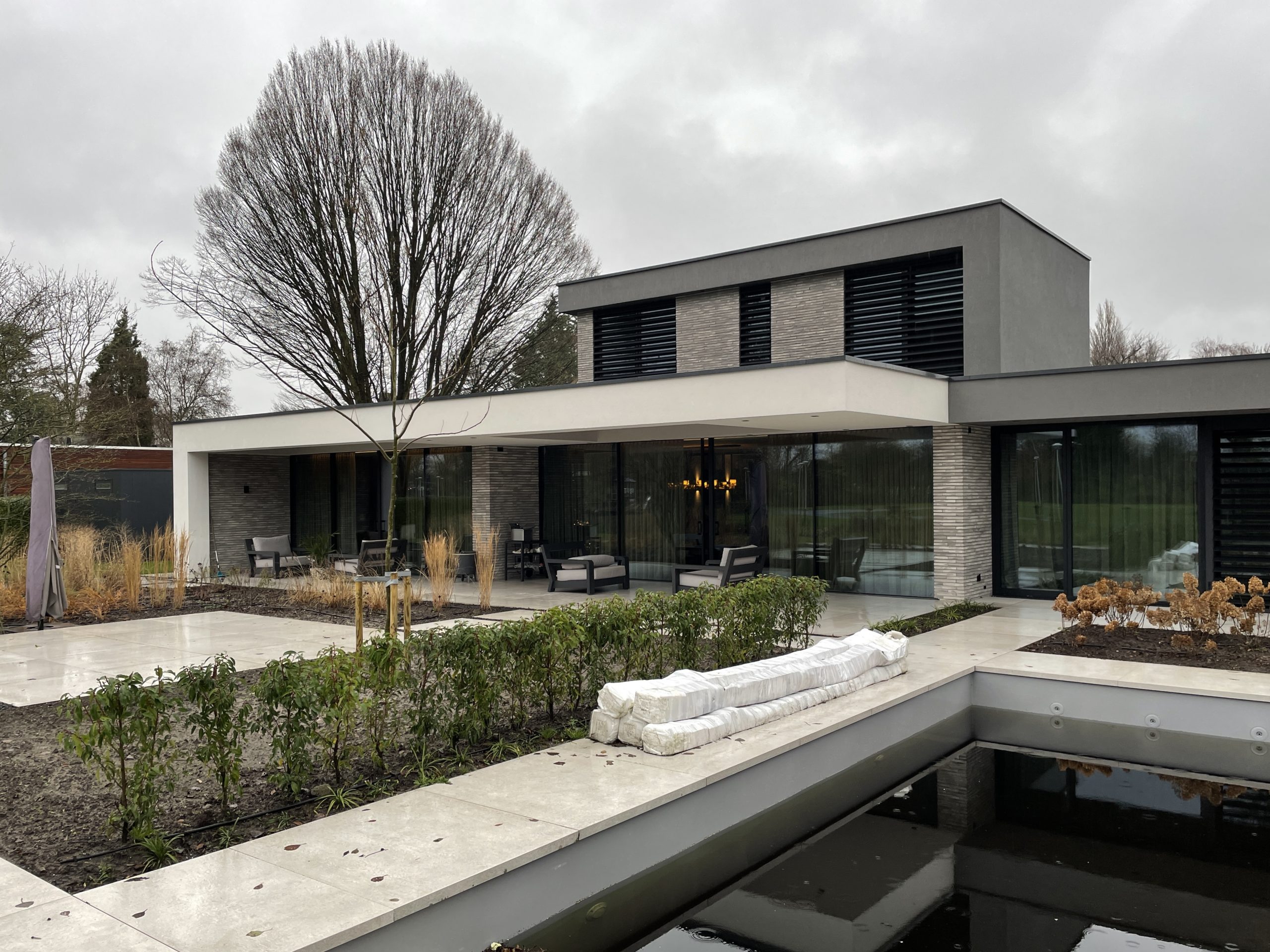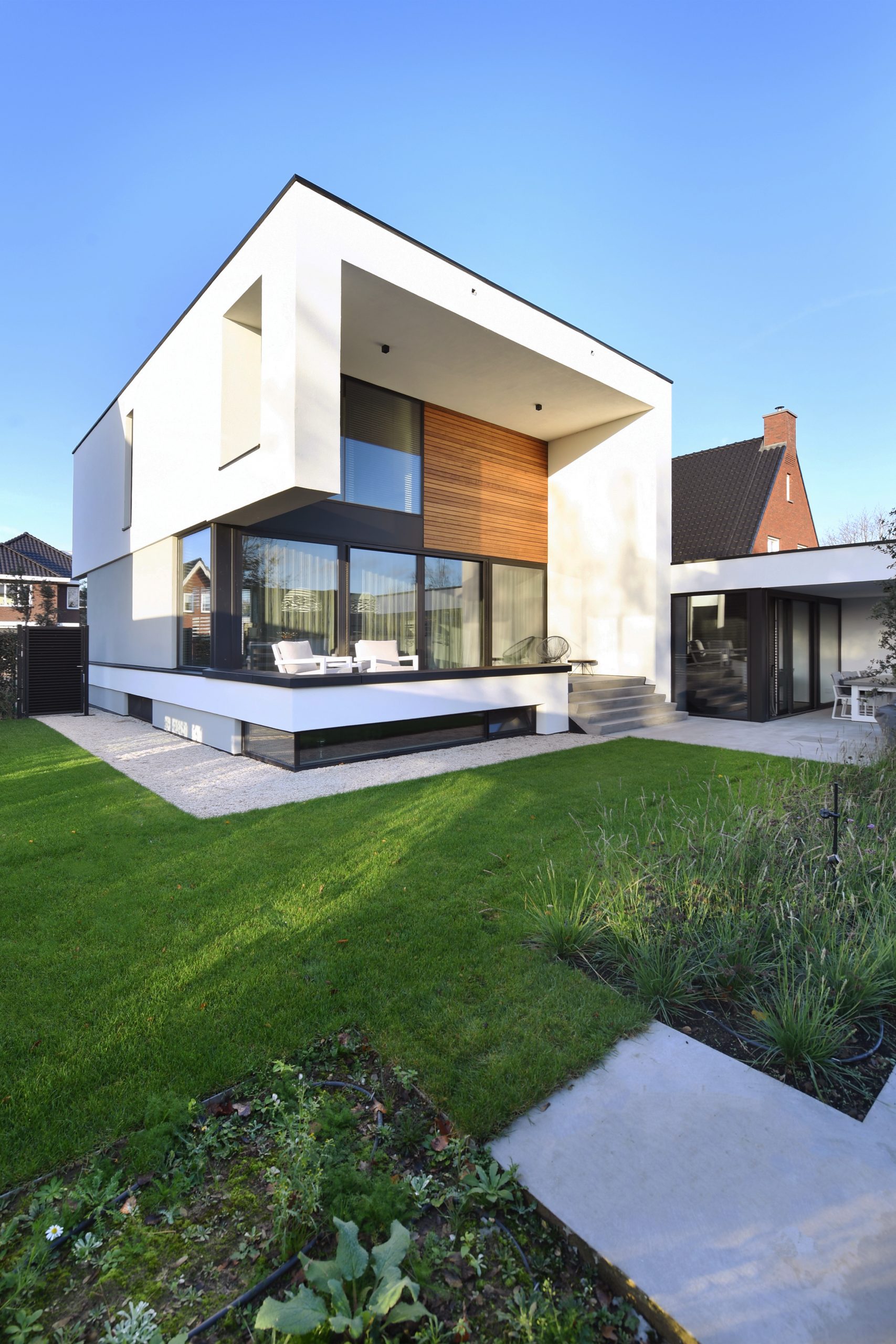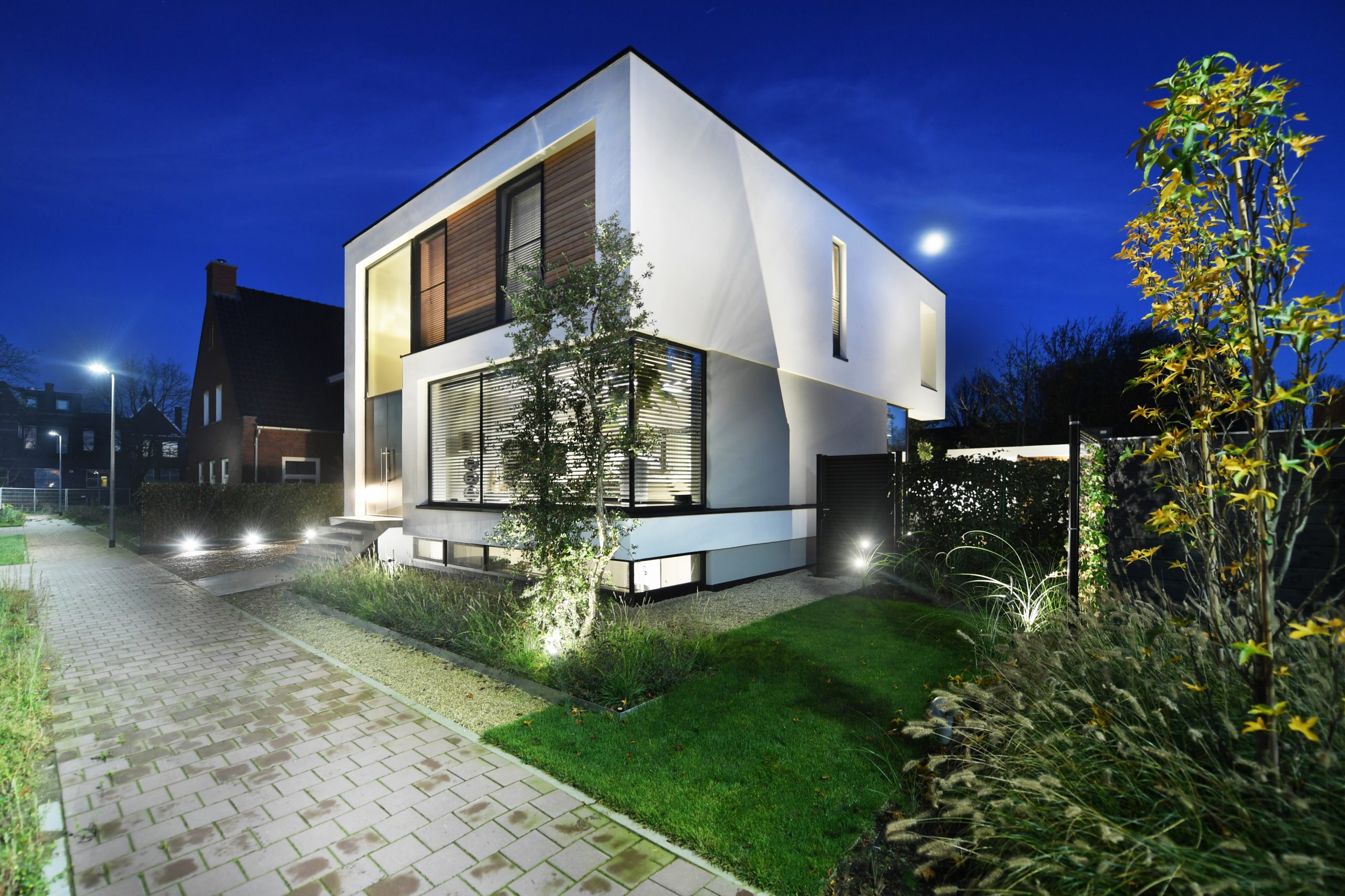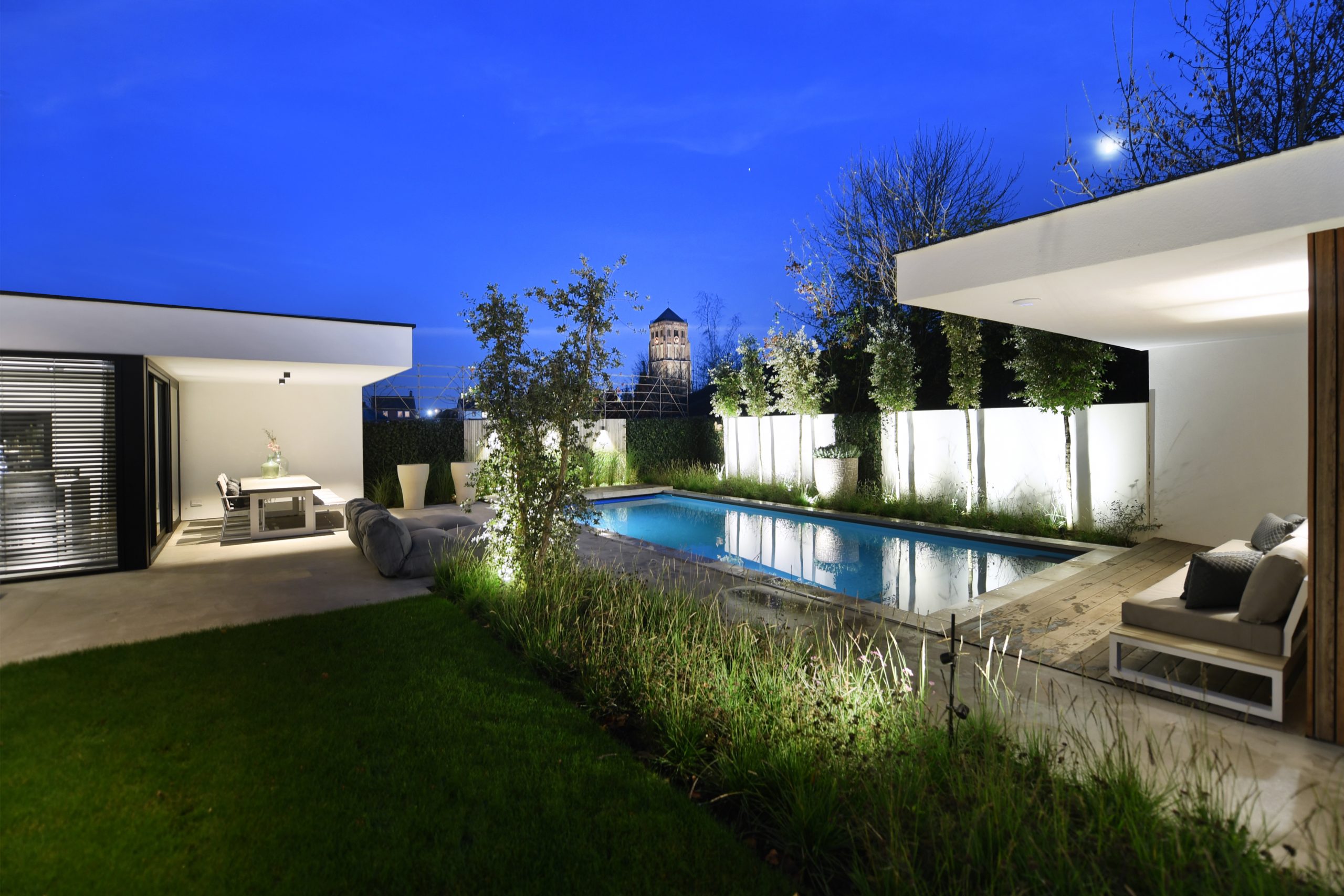 Villa 12 is characterized by its expressive lines, creating a modern and luxurious feel. This modern play of lines can be seen on all four sides of the house, creating a real statement in every direction. The two side facades are mostly closed, creating privacy from the neighbours, while the front and rear facades are opened up to ensure sightlines and natural daylight. The main building is also lifted from the ground to provide natural daylight to the basement. All these decisions are emphasized by expressive white stucco lines.