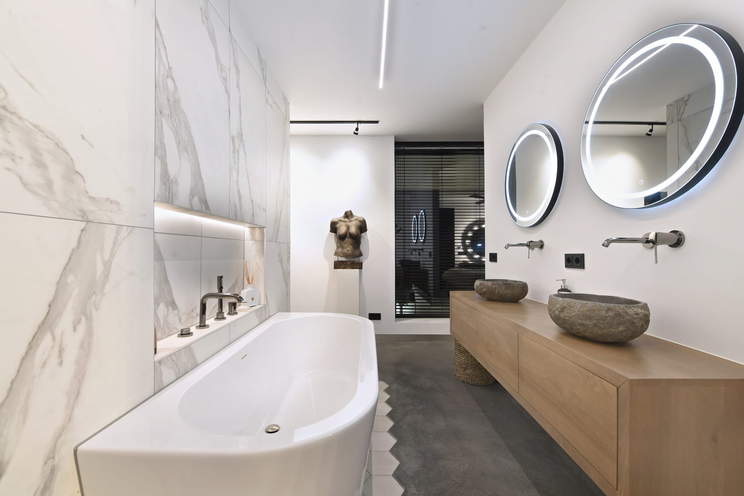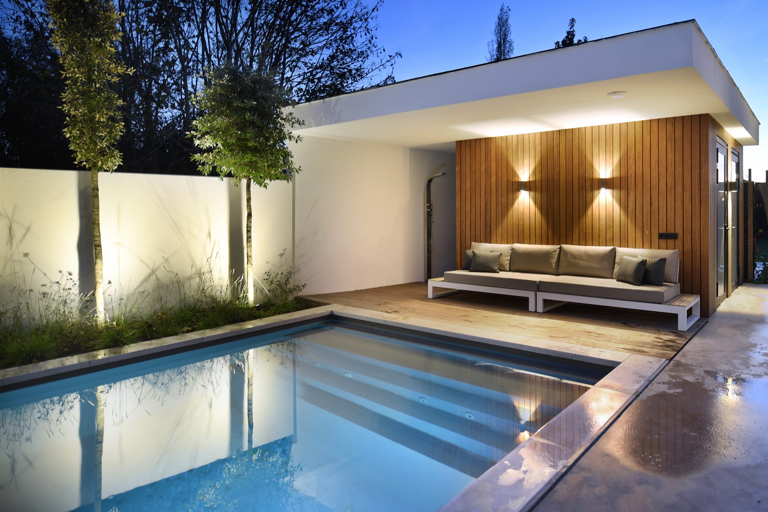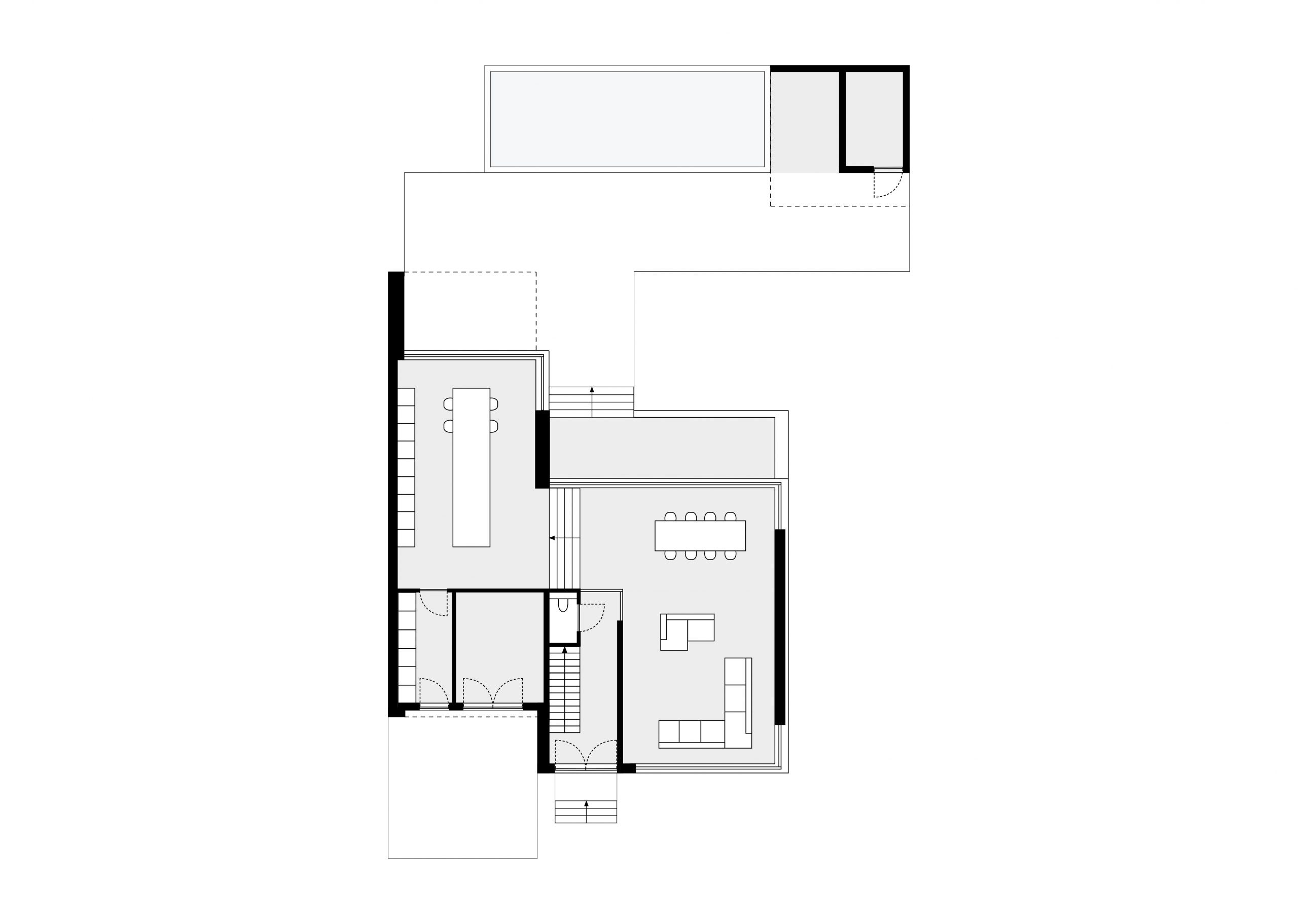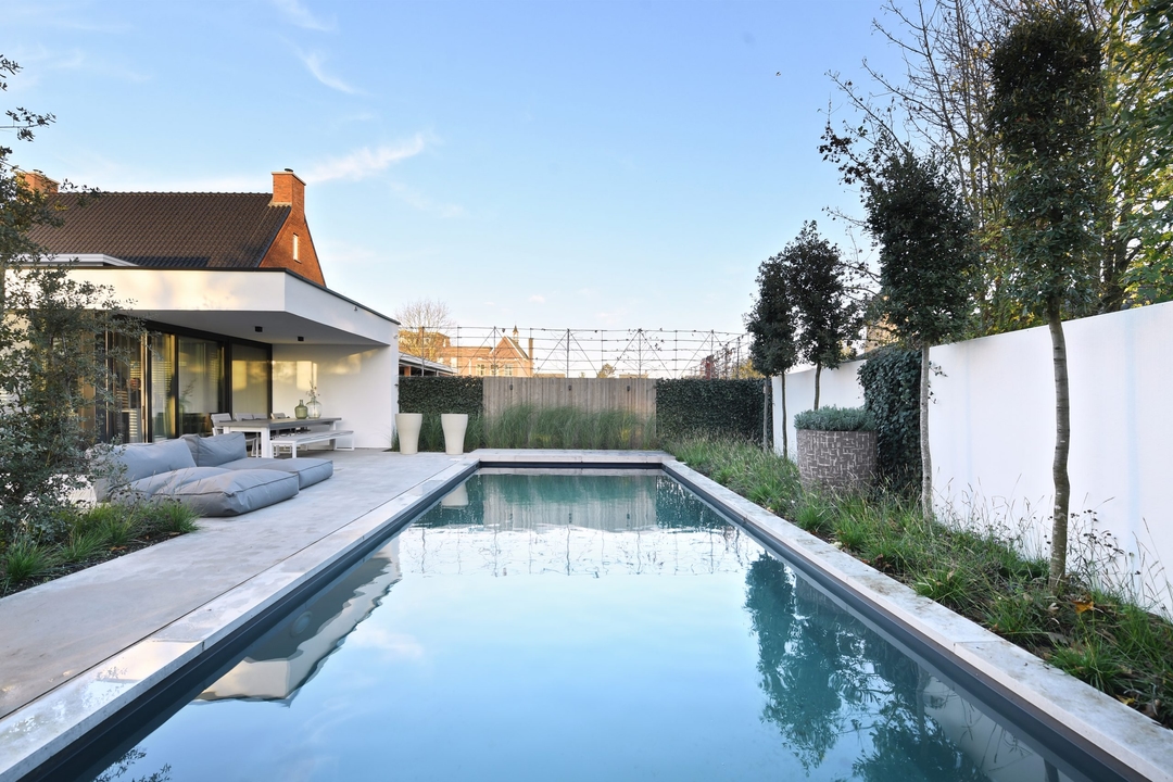 Villa 12 is characterized by its expressive lines, creating a modern and luxurious feel. This modern play of lines can be seen on all four sides of the house, creating a real statement in every direction. The two side facades are mostly closed, creating privacy from the neighbours, while the front and rear facades are opened up to ensure sightlines and natural daylight. The main building is also lifted from the ground to provide natural daylight to the basement. All these decisions are emphasized by expressive white stucco lines.