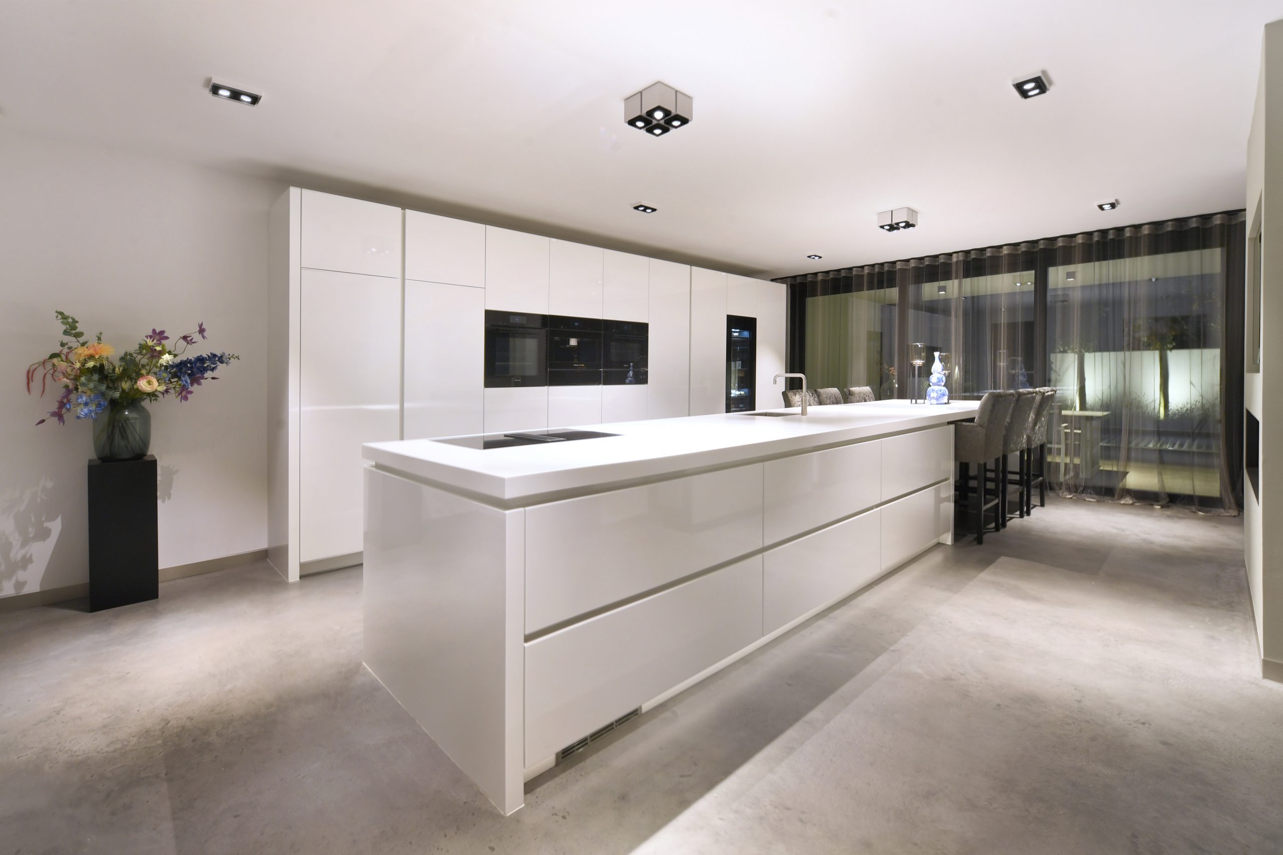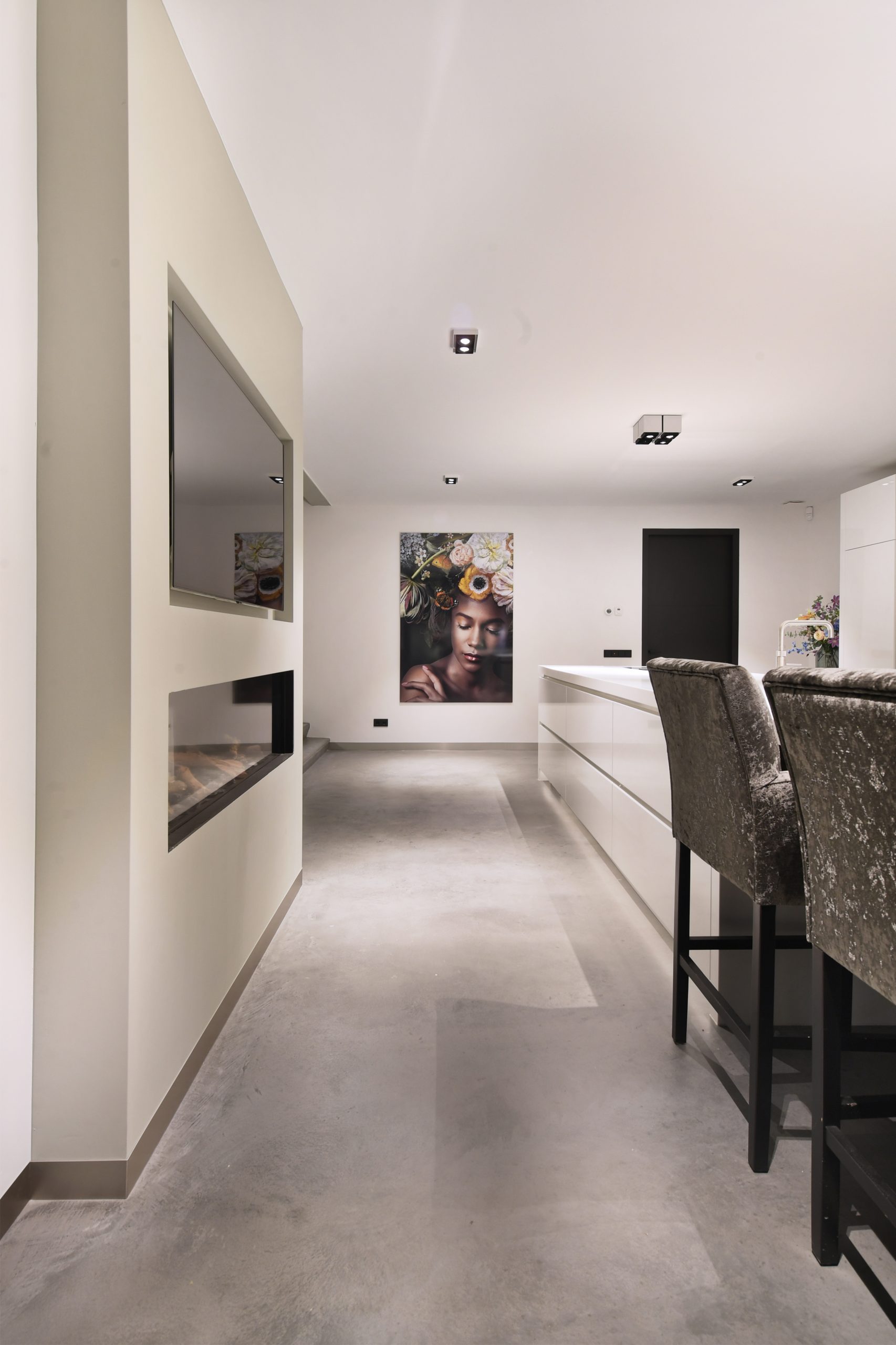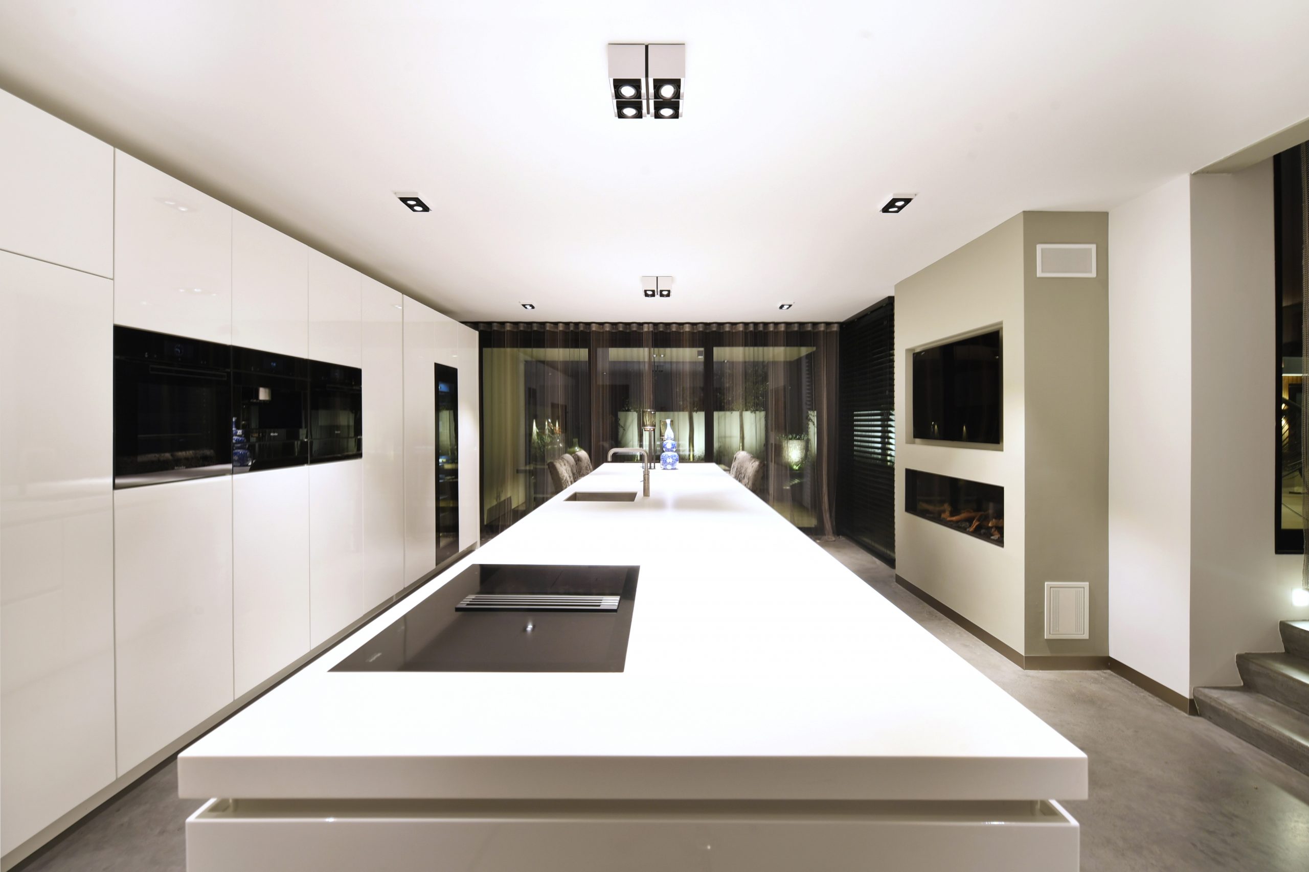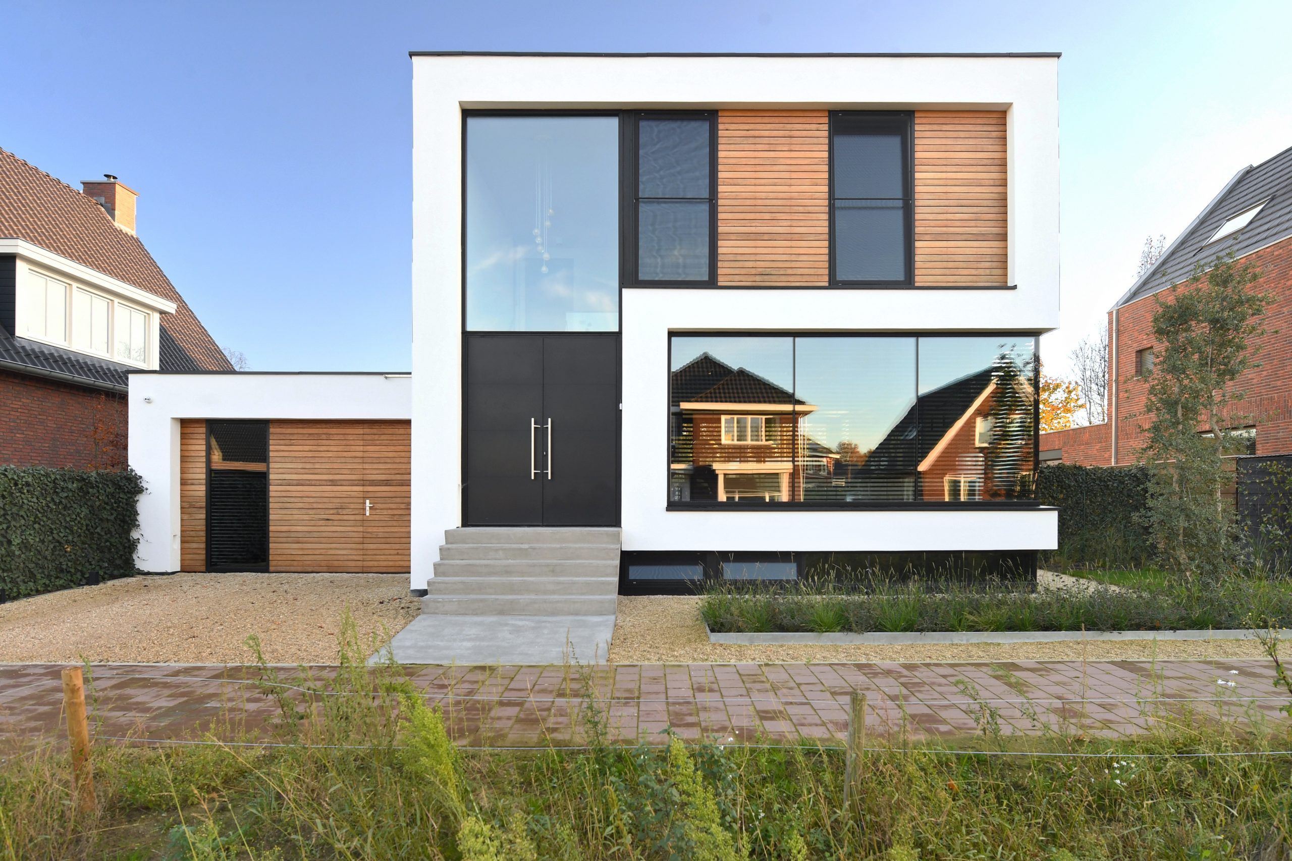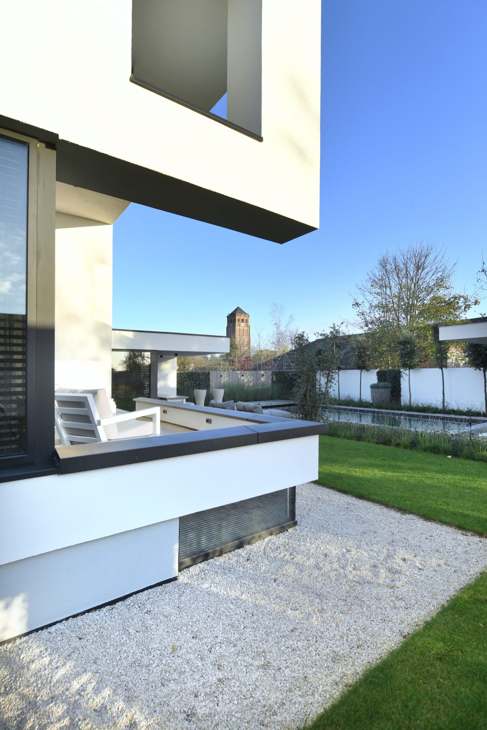 The 5-meter tall exterior void on the rear facade creates a dramatic view. By extending the roof and walls on the first floor, the white line embraces the main building. Thus the rear facade has a unique composition with impressive depth. This depth also has two practical functions. Firstly it reduces direct sunlight on the warmest parts of the day, preventing the building from heating up too much in summer. Secondly, it creates shelter from the rain, allowing the aluminium sliding doors to be opened even when it rains. The large overhang is accentuated by the lower extended line, creating a covered terrace in front of the kitchen.
