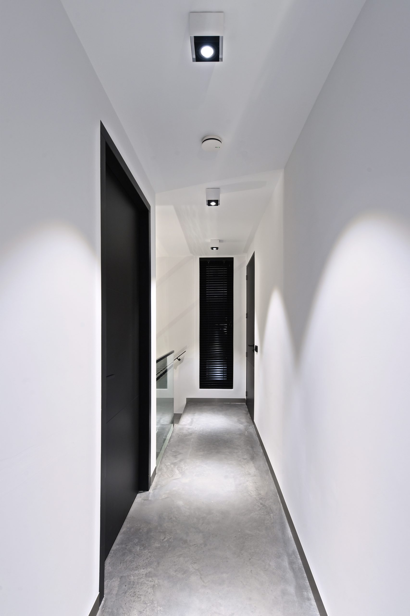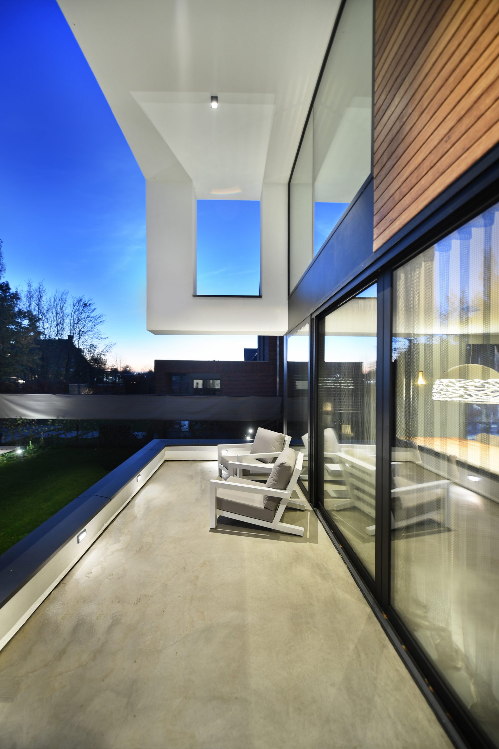 The 5-meter tall exterior void on the rear facade creates a dramatic view. By extending the roof and walls on the first floor, the white line embraces the main building. Thus the rear facade has a unique composition with impressive depth. This depth also has a practical functions, it reduces direct sunlight on the warmest parts of the day, preventing the building from heating up too much in summer.