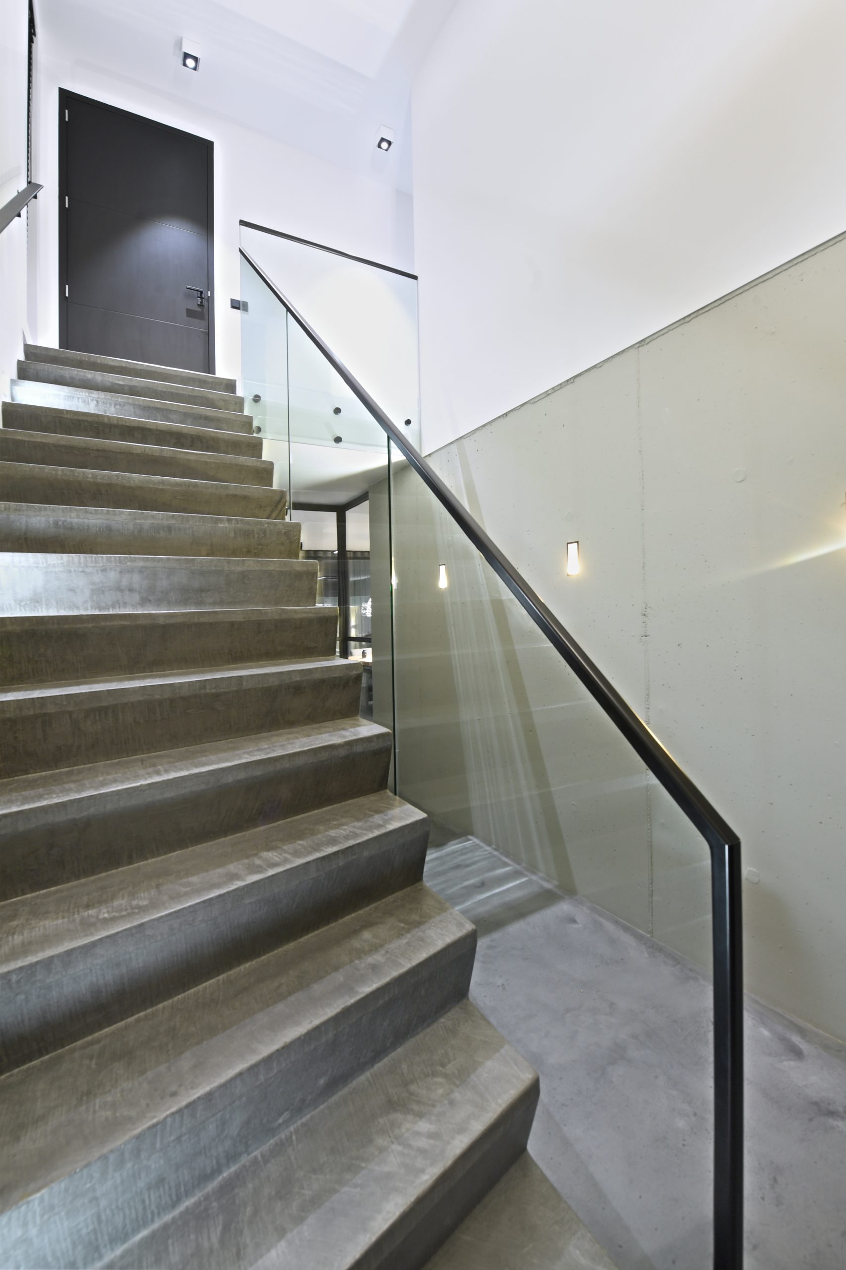 The modern aesthetic of the design is enhanced by the main material, clean white stucco. Because the stucco is plain white and has no distracting texture, all attention is directed to the architectural lines. Its purpose is to highlight the unique structure.