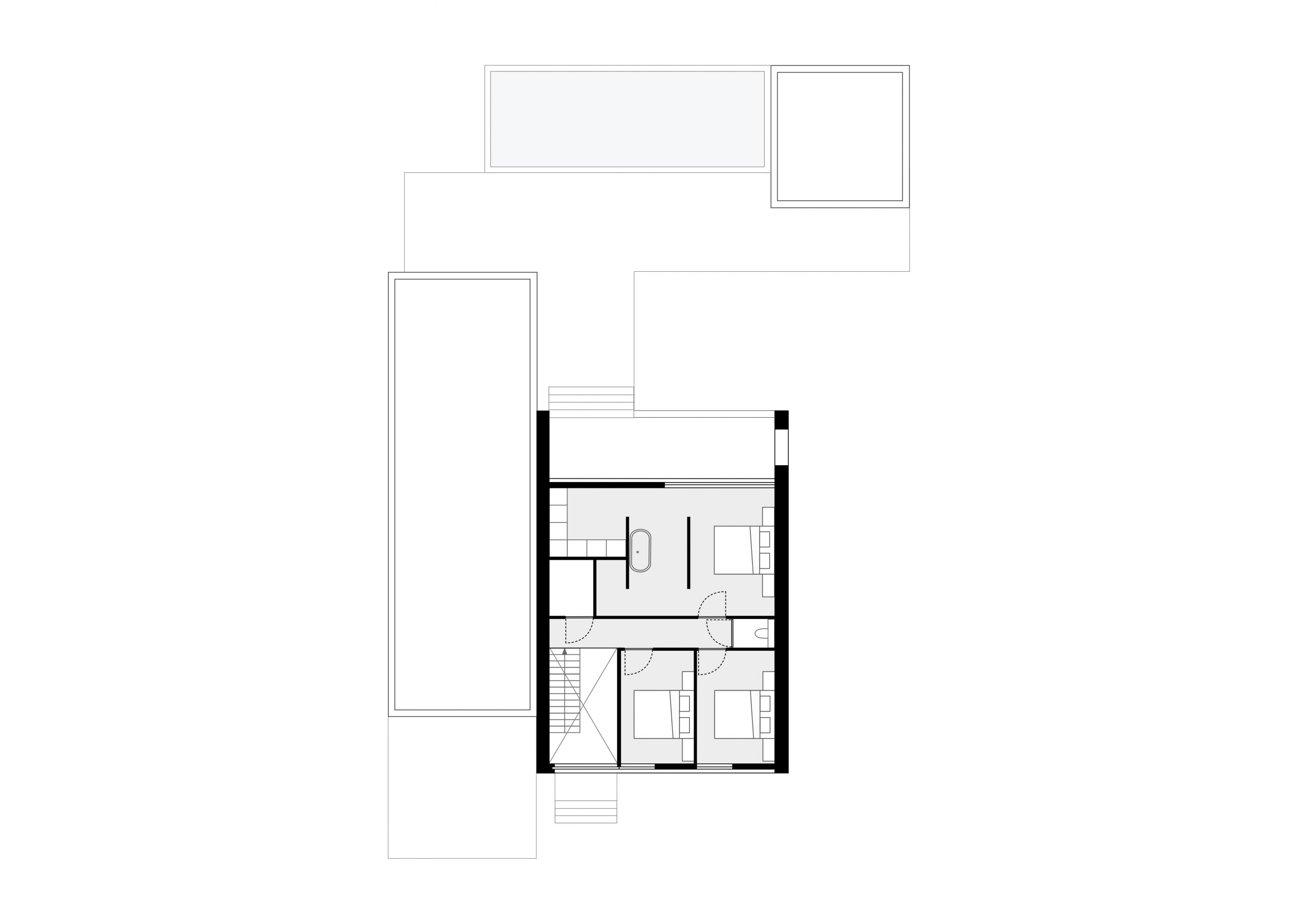 ” A clean void is made in the extension of the right facade. Its dimensions match the window directly next to it, creating a balanced composition. By doing this, the first floor feels less confined and more open. It adds interesting sight lines and creates a literal framed view. This view is westward, meaning the setting sun shines directly through this void, filling the master bedroom with evening light. “