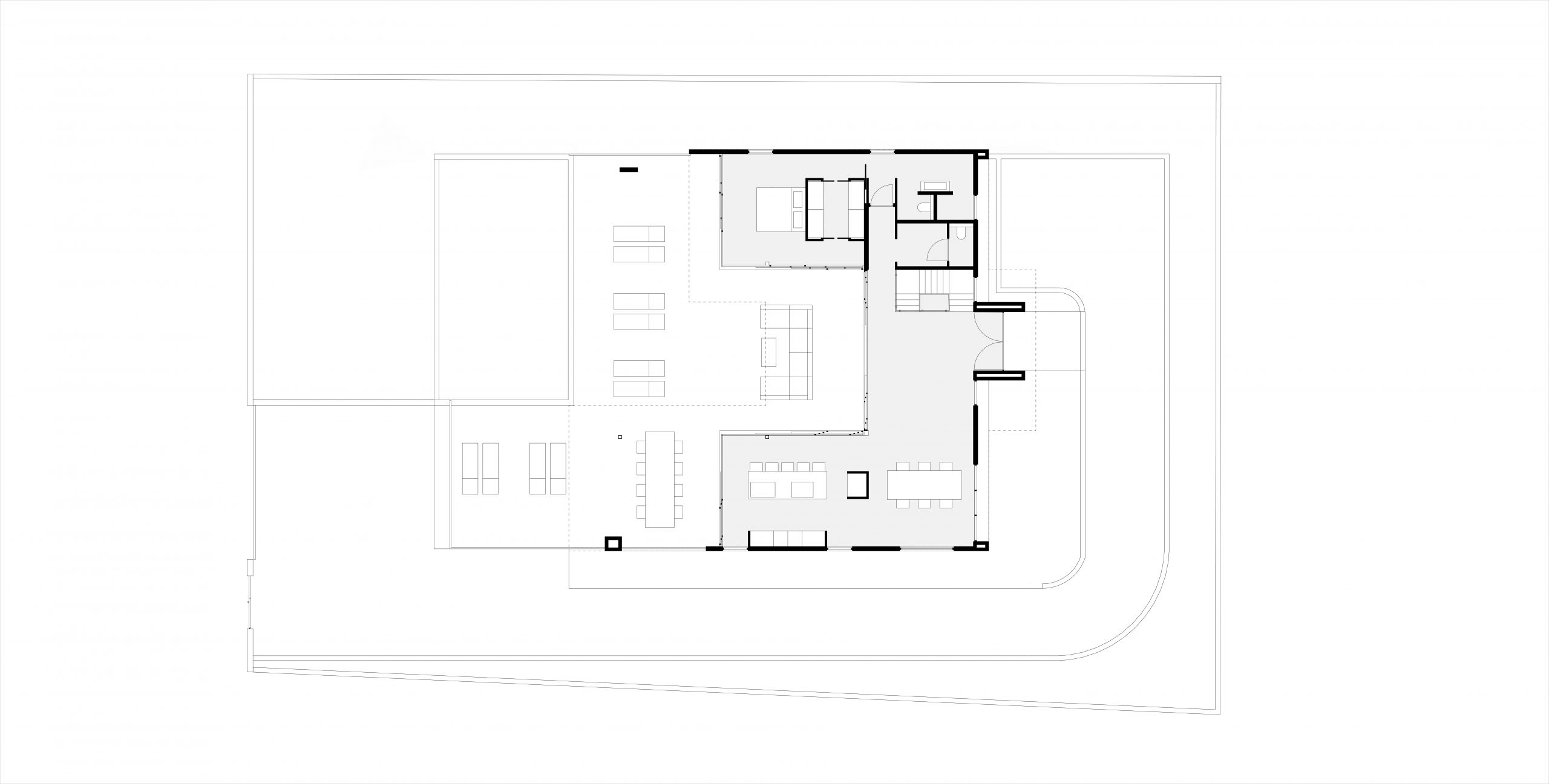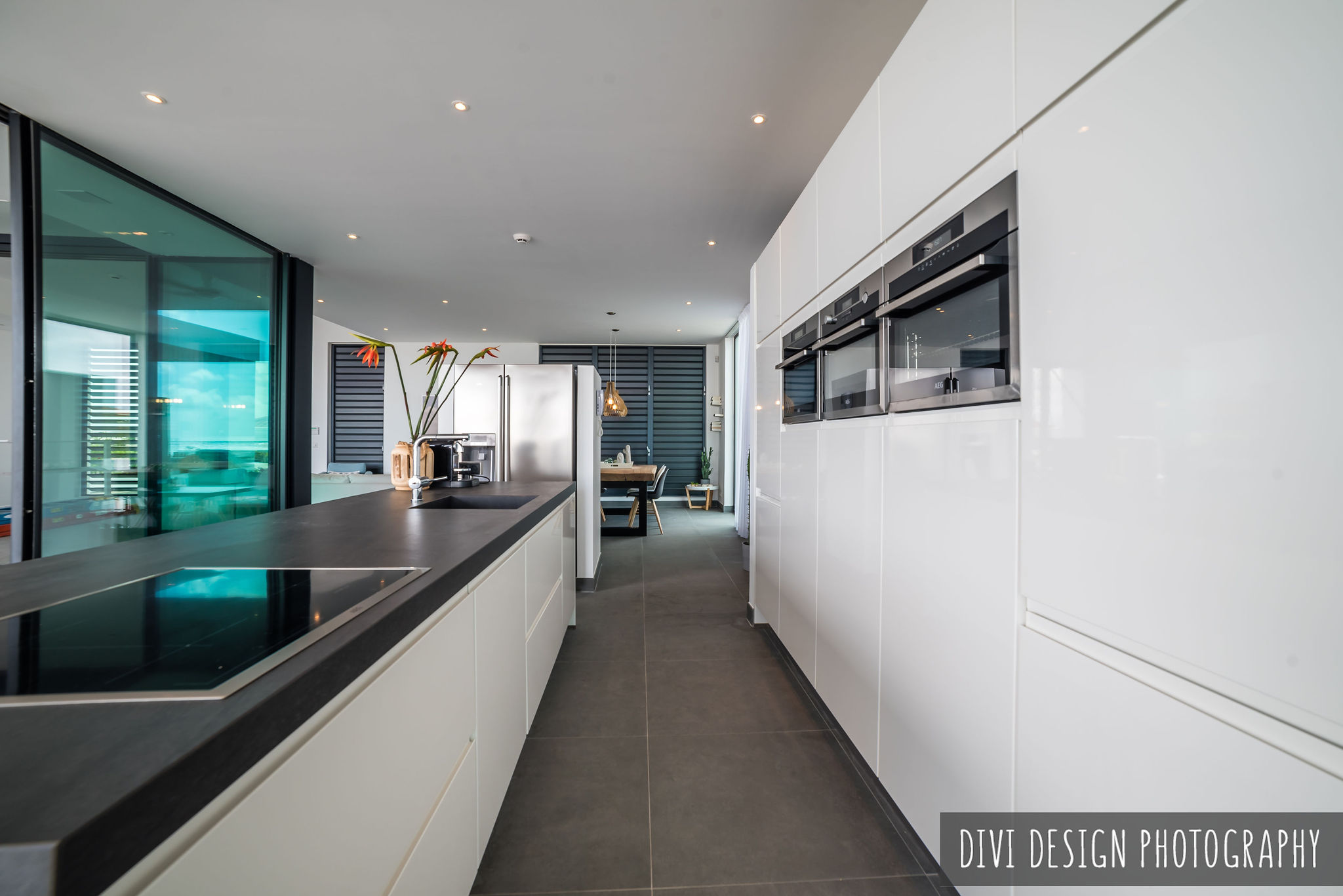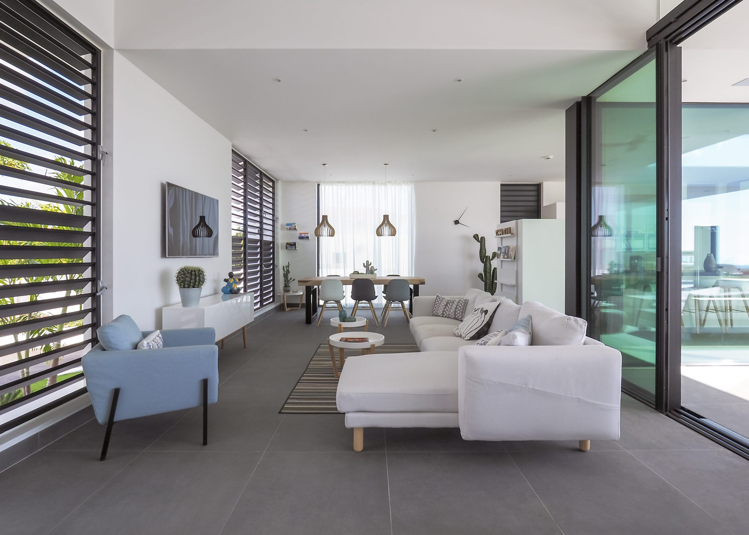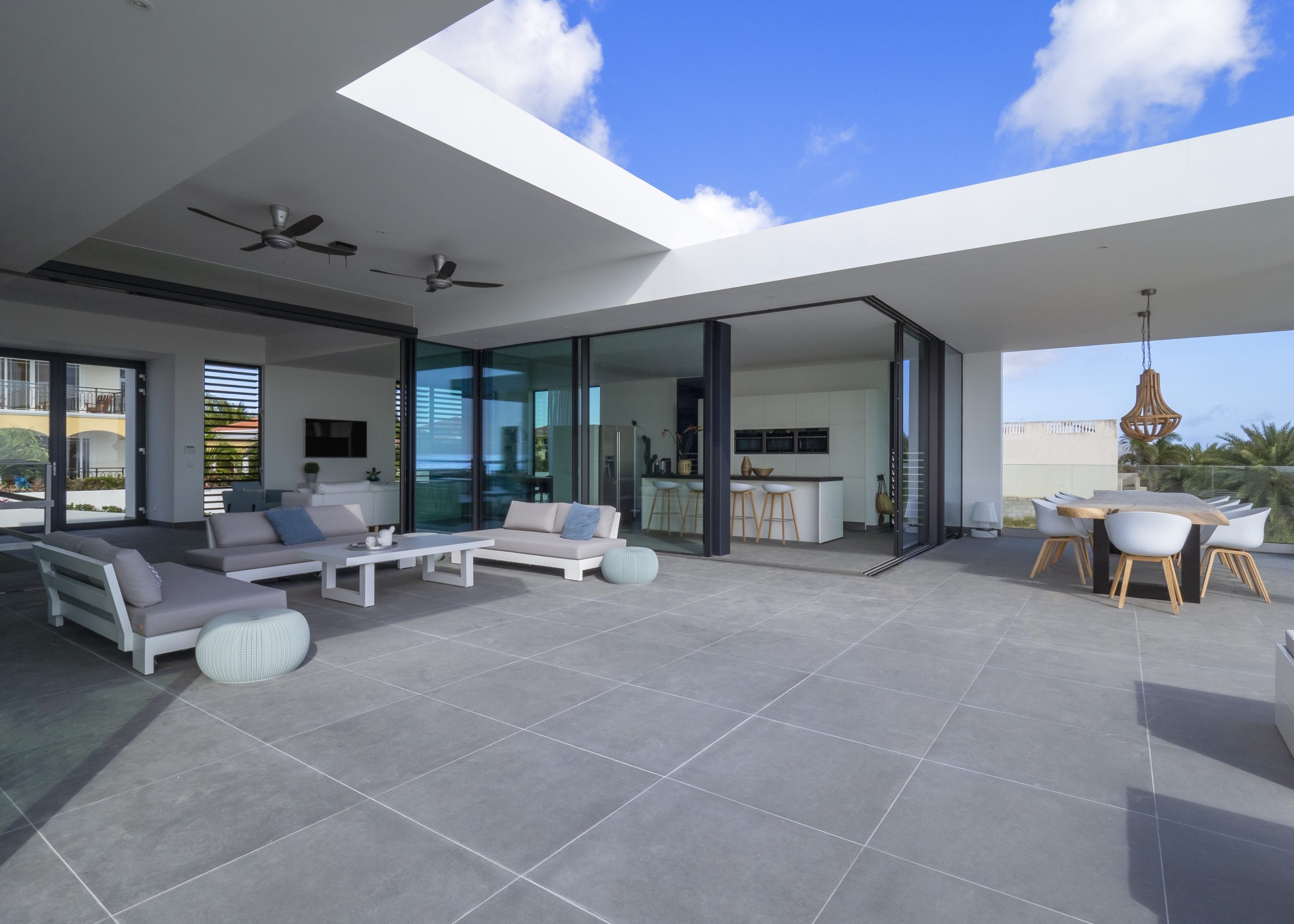 Large minimalistic glass facades are used to open up and connect the main living areas to the large outdoor living area and pool, whilst large light grey floor tiles are used to make sure the indoor and outdoor areas merge perfectly.