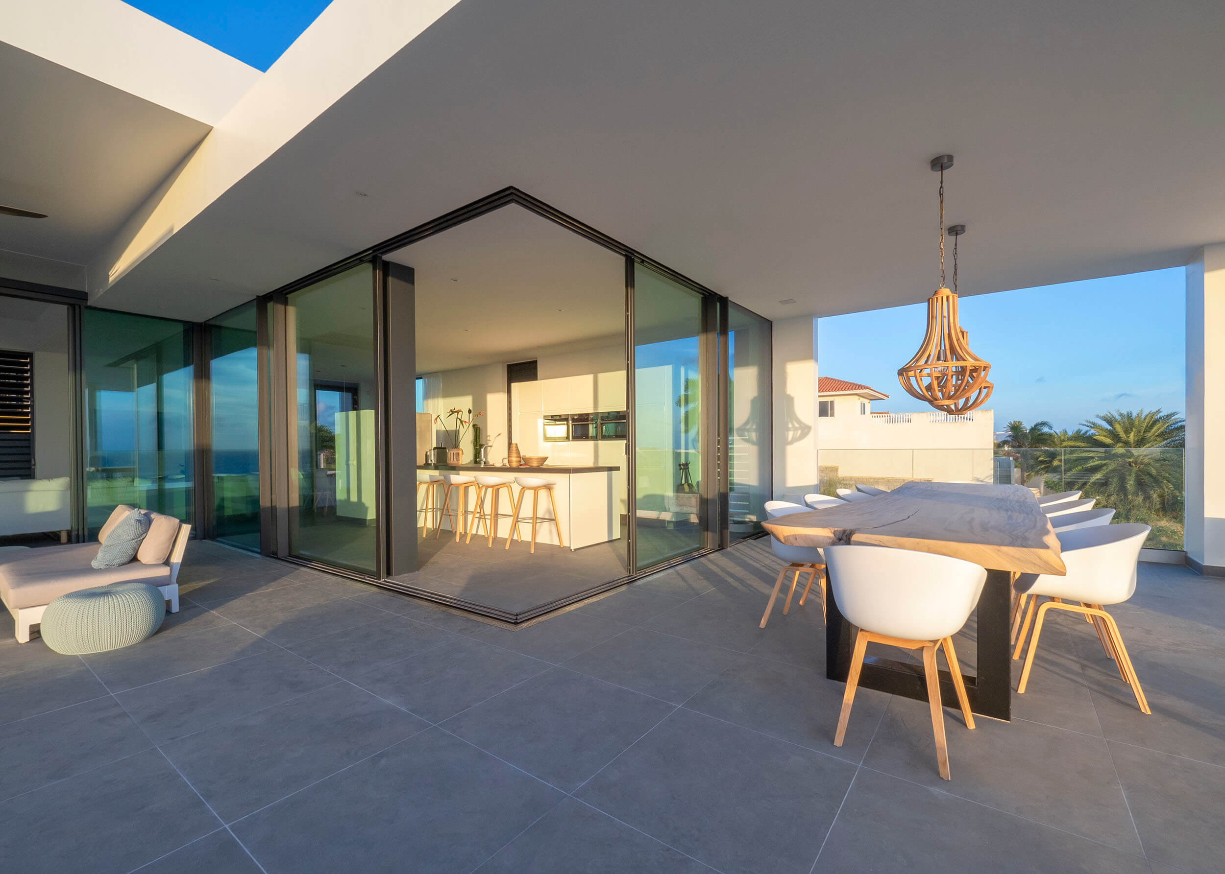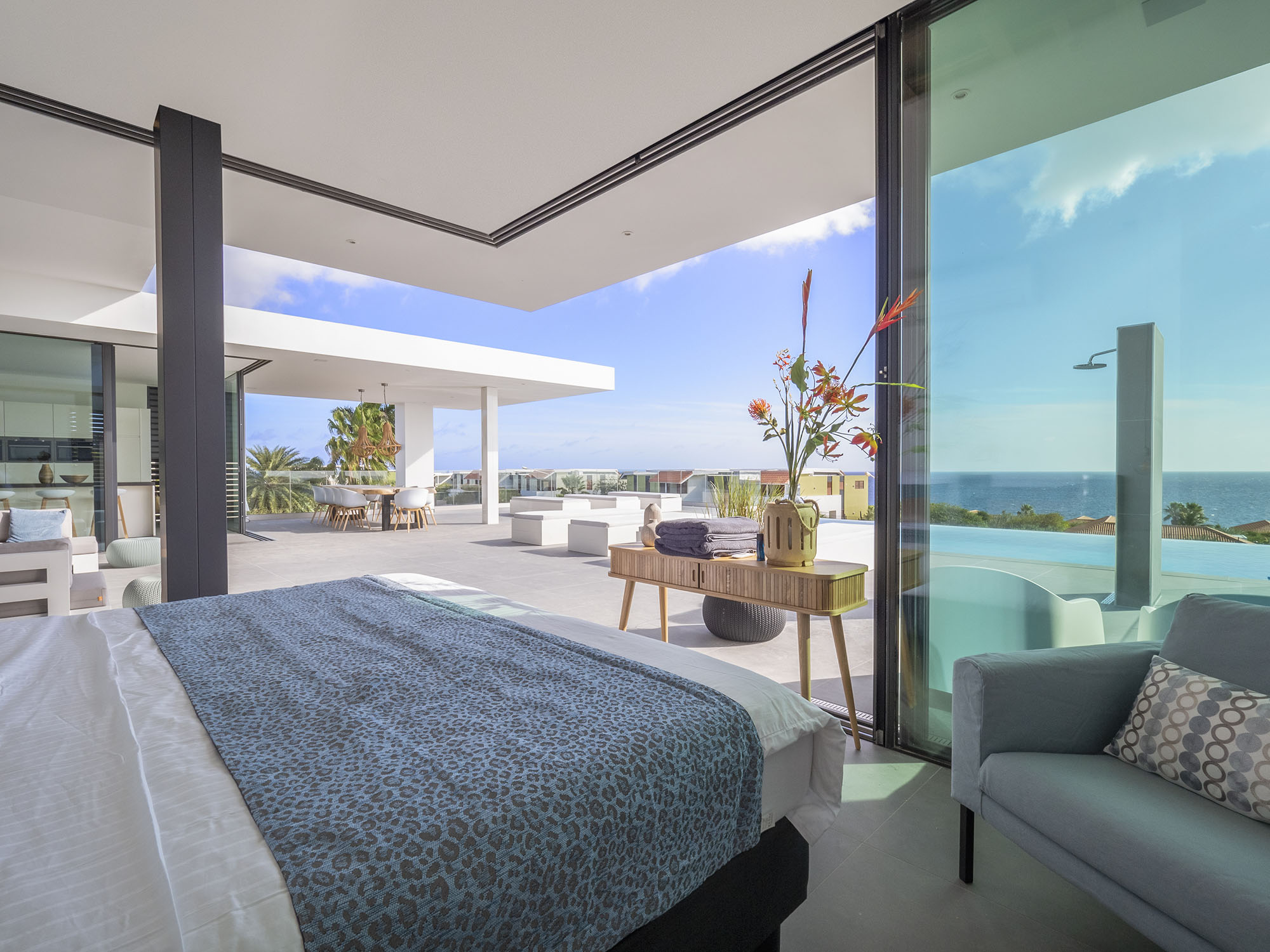The large glass sliding doors connect seamlessly creating a direct connection between the main indoor areas and large outdoor area combined with infinity pool.